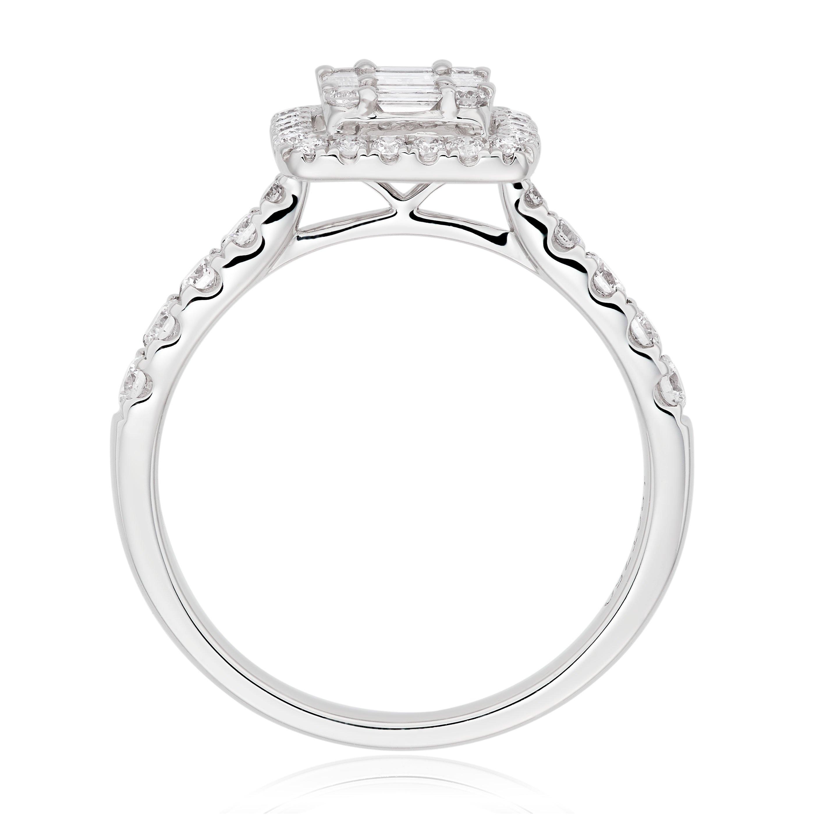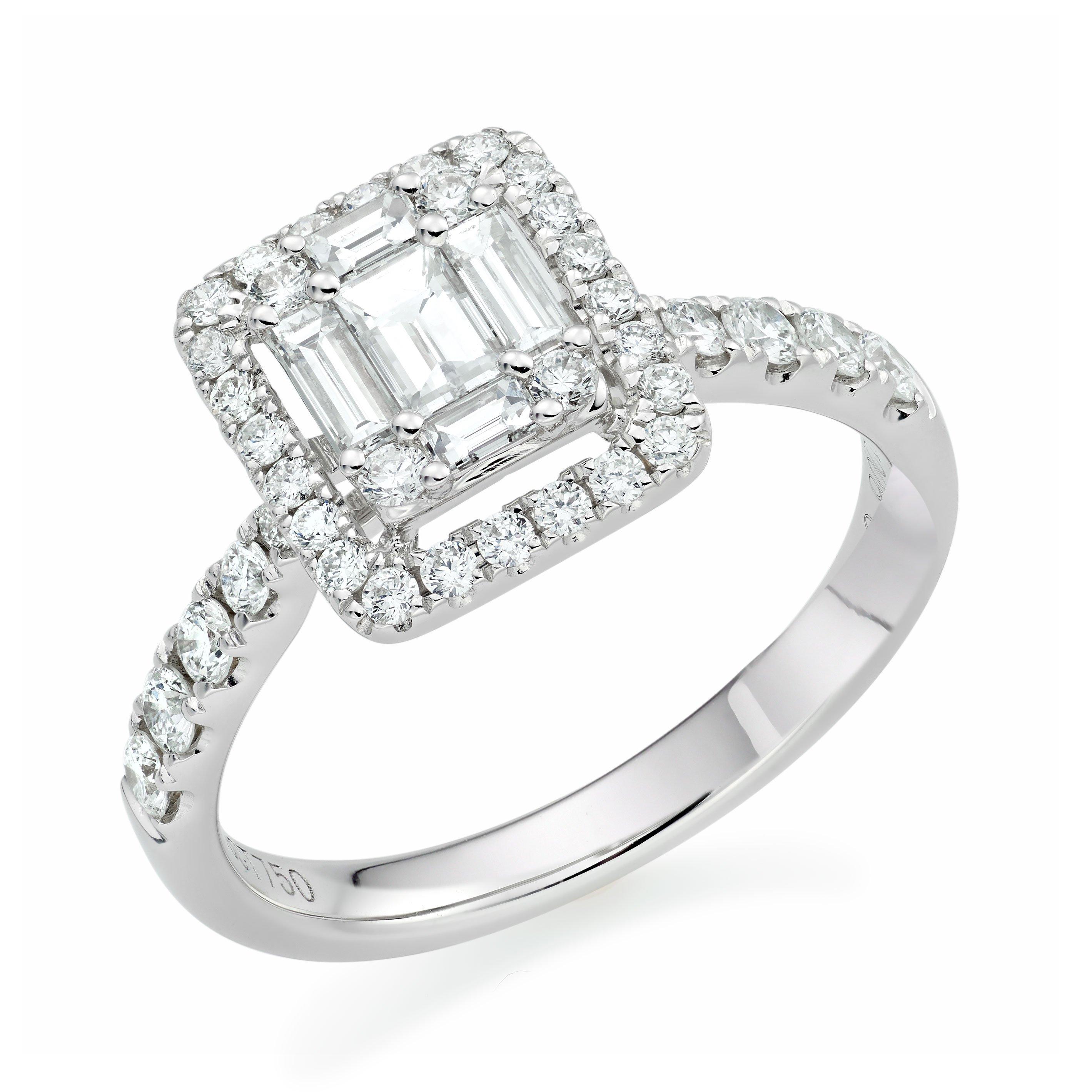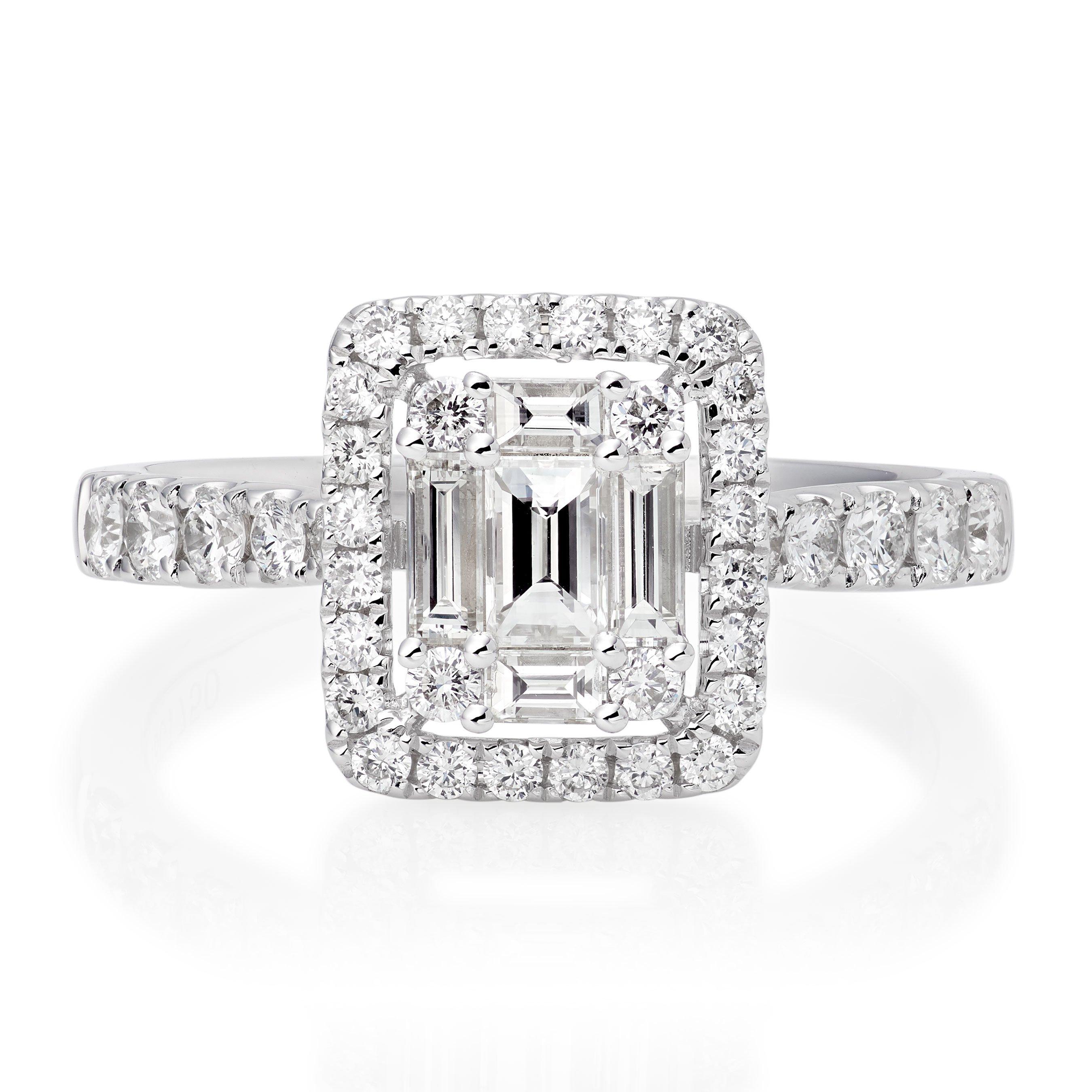 This stunning 18ct White Gold Diamond Halo Ring combines sparkle and sophistication and is the perfect way to declare your love. At A Glance Crafted in 18ct white gold Round brilliant and baguette shaped diamonds with shoulder set stones Diamond colour - G Diamond clarity - SI1 Total diamond carat weight - 0.91ct Please note there could be a 5% variance on the diamond carat weight, as every diamond is unique