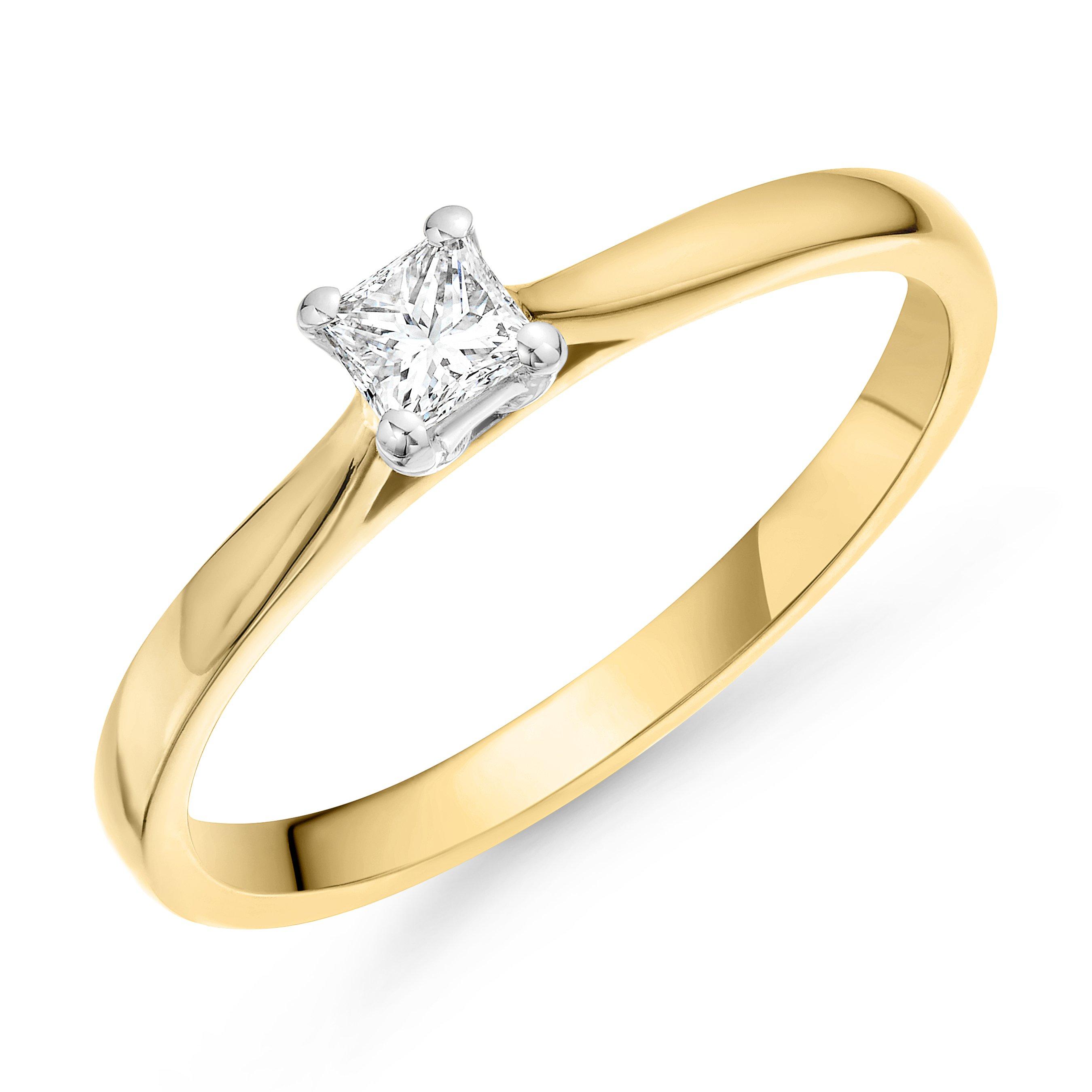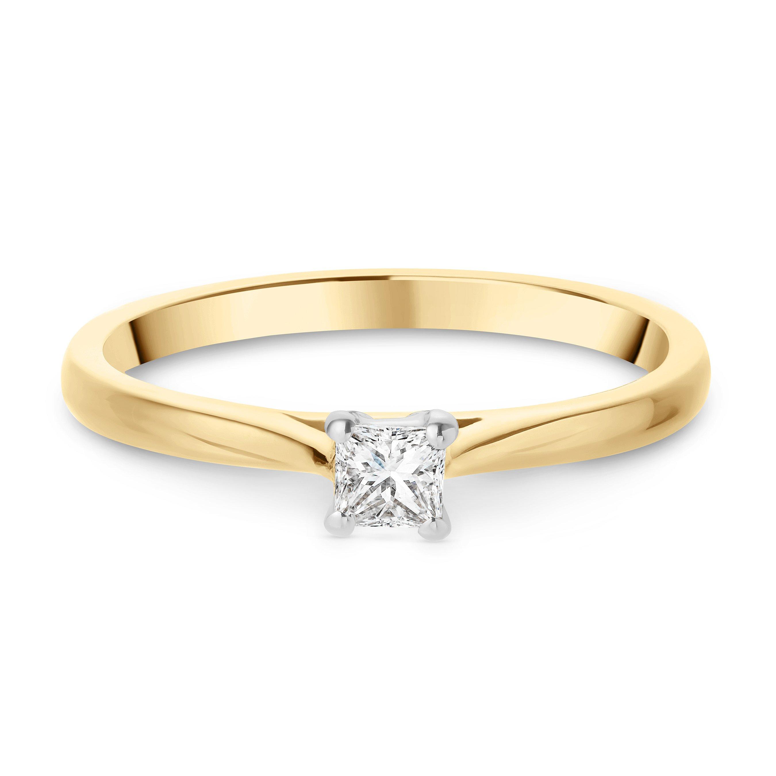 Leave your loved one feeling on top of the world with this 18ct Yellow Gold Princess Diamond Solitaire Ring. Designed to set their heart on fire with its breath taking sparkle and shine, this ring is a beautiful representation of the romantic bond you share. At A Glance Crafted in 18ct white gold Featuring a diamond Diamond colour - G Diamond carat weight - 0.20 Diamond cut - princess Diamond clarity - SI1 Please note there may be a 5% variance on the diamond carat weight, as every diamond is unique