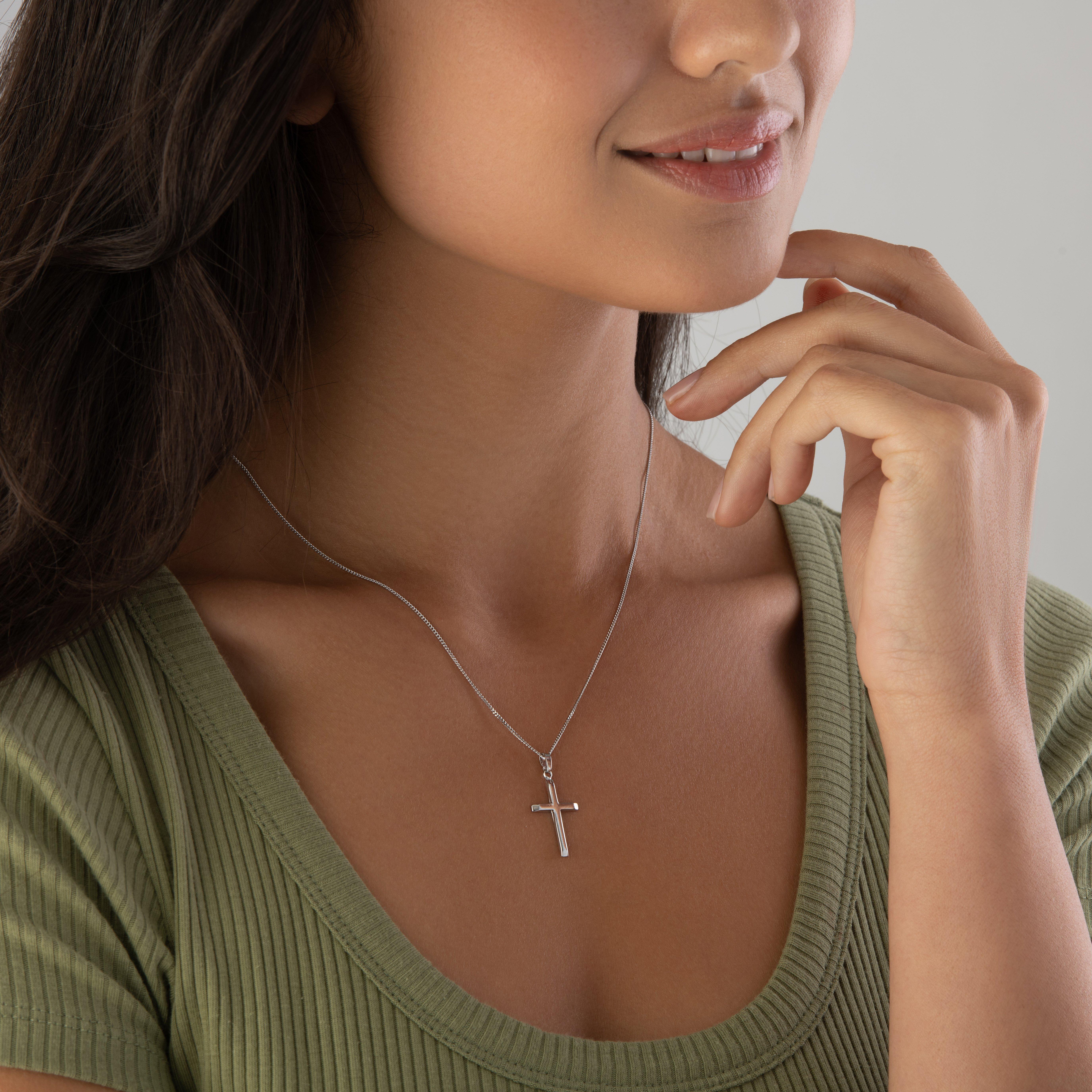 9ct White Gold cross pendant and necklace. The White Gold necklace is enhanced with the cross pendant and makes this cool piece of jewellery. This 9ct white gold cross pendant is a great gift for her that she will love. Pendant Length 25mm. Pendant Width 15mm. Necklace Length 45cm.