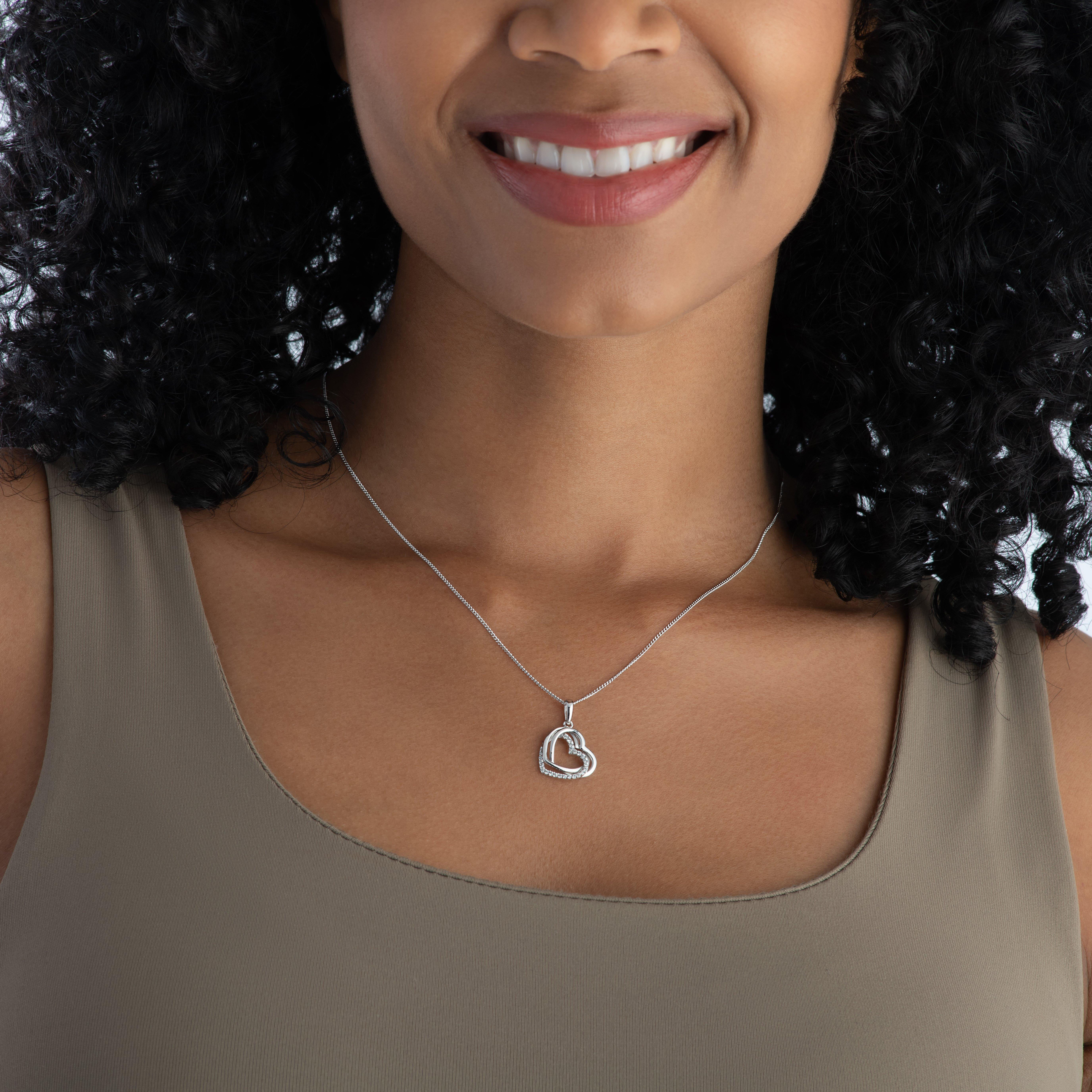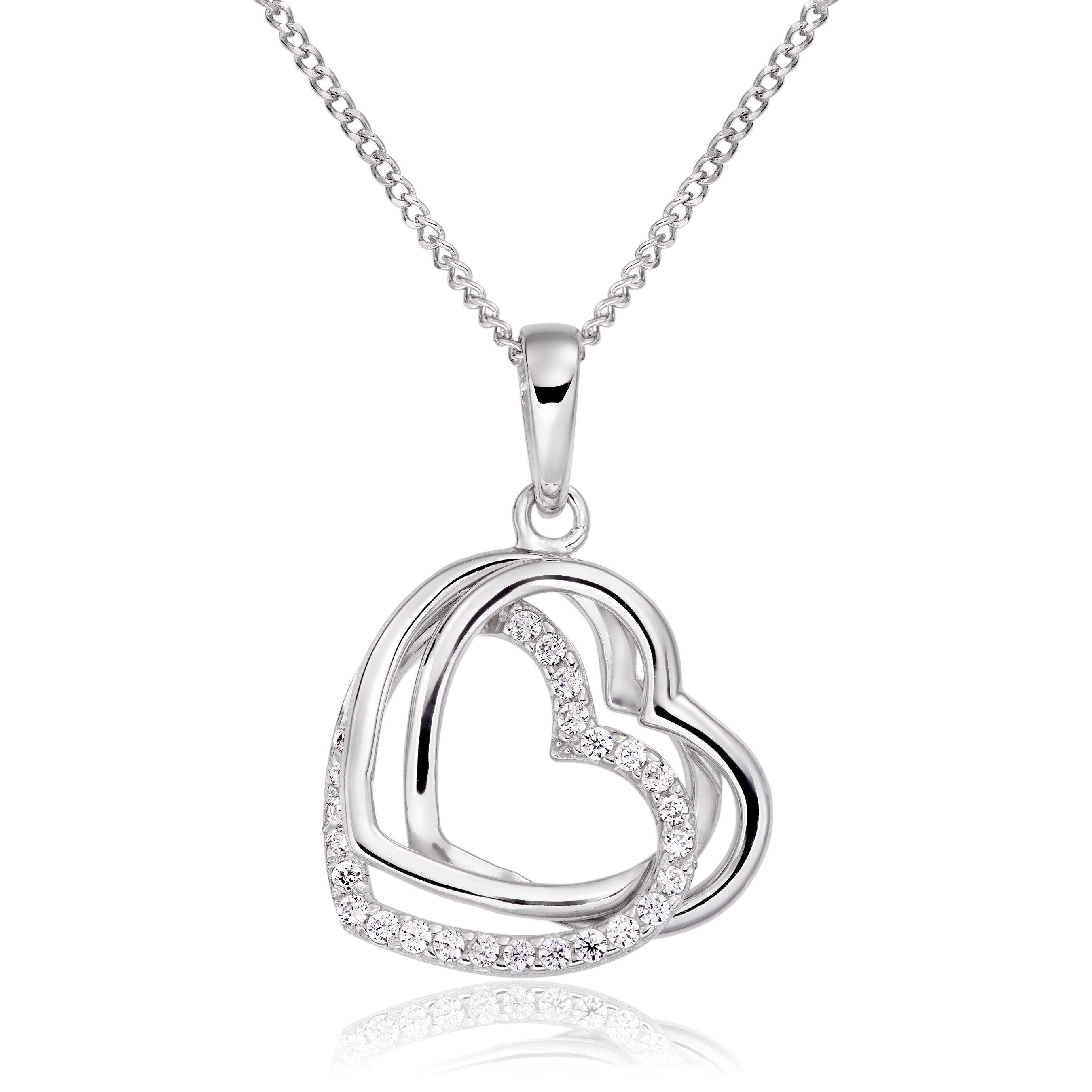 Hearts will come alive with this elegantly designed 9ct White Gold Cubic Zirconia Heart Pendant, sophisticated with a touch of sparkle. At A Glance 9ct white gold Cubic Zirconia embellishment on 1 heart Interlocking heart design 18" white gold chain