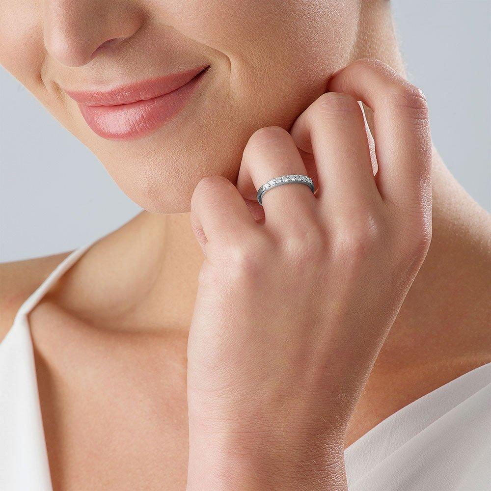 Filled with meaning and sparkle, this 9ct white gold diamond half eternity ring is designed to provide you with a lifetime of lasting memories of your special day. Beautifully crafted in 9ct white gold, a dazzling row of round brilliant diamonds are elegantly embedded in the glistening band. Simple yet breathtaking, this half eternity ring is the perfect way to symbolise your true love and romance. Diamond information: Cut - round brilliant, Colour - H, Clarity - SI2, Carat weight - 0.25ct. Shop the men's 9ct white gold diamond wedding ring, featured in the model image.Please note there could be a 5% variance on the diamond carat weight, as every diamond is unique.
