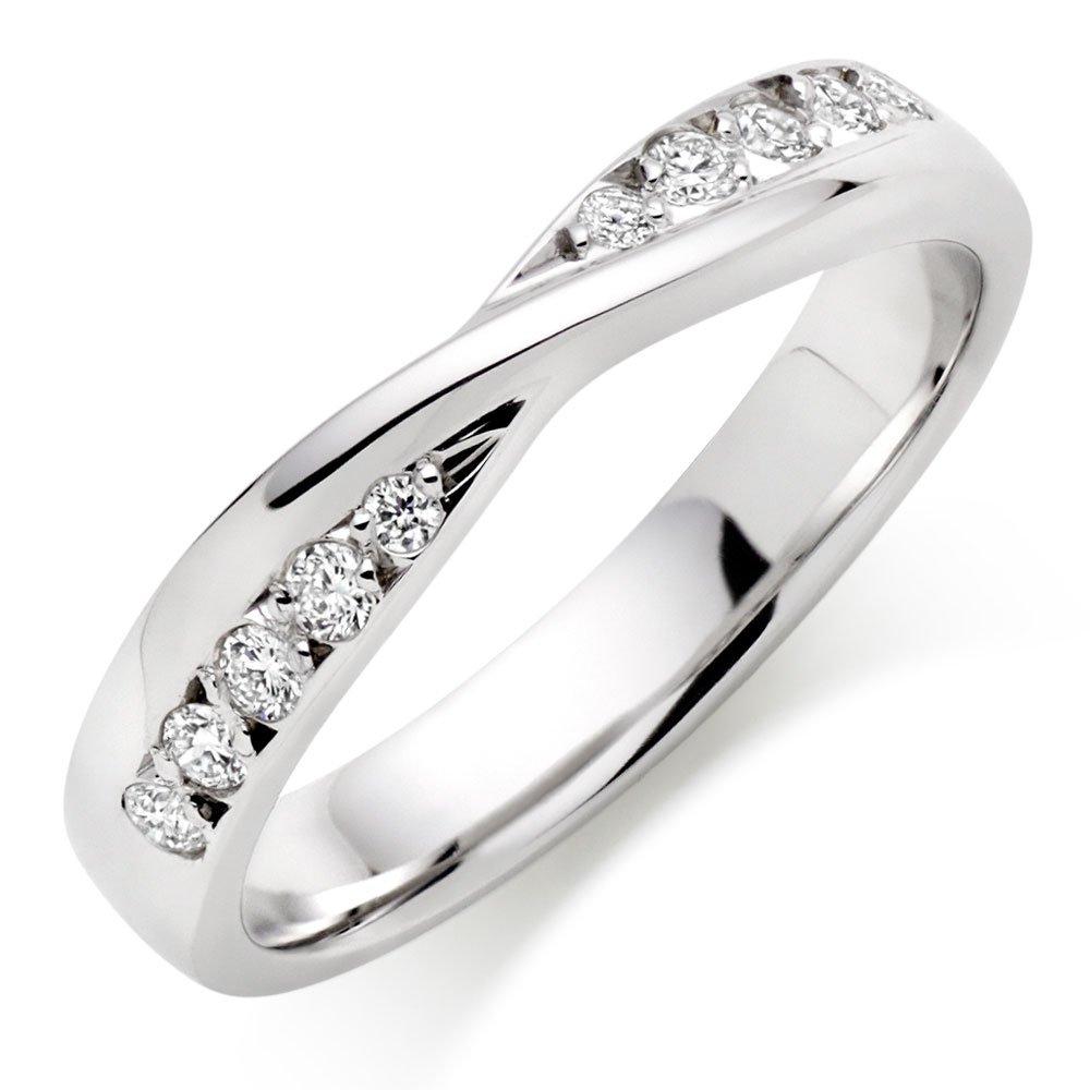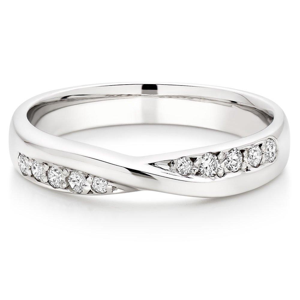 Elegant and distinctly feminine, this beautiful 9ct white gold diamond wedding ring will make you feel truly bridal. Featuring a beautiful and eye-catching twisted design, each side of the twist is embellished with five glittering diamonds which sparkle brilliantly. A gorgeous symbol of your love, you'll treasure this delicate ring forever. Diamond information: Cut - round brilliant, Colour - I, Clarity - P1, Carat weight - 0.15ct.. Please note there could be a 5% variance on the diamond carat weight, as every diamond is unique.