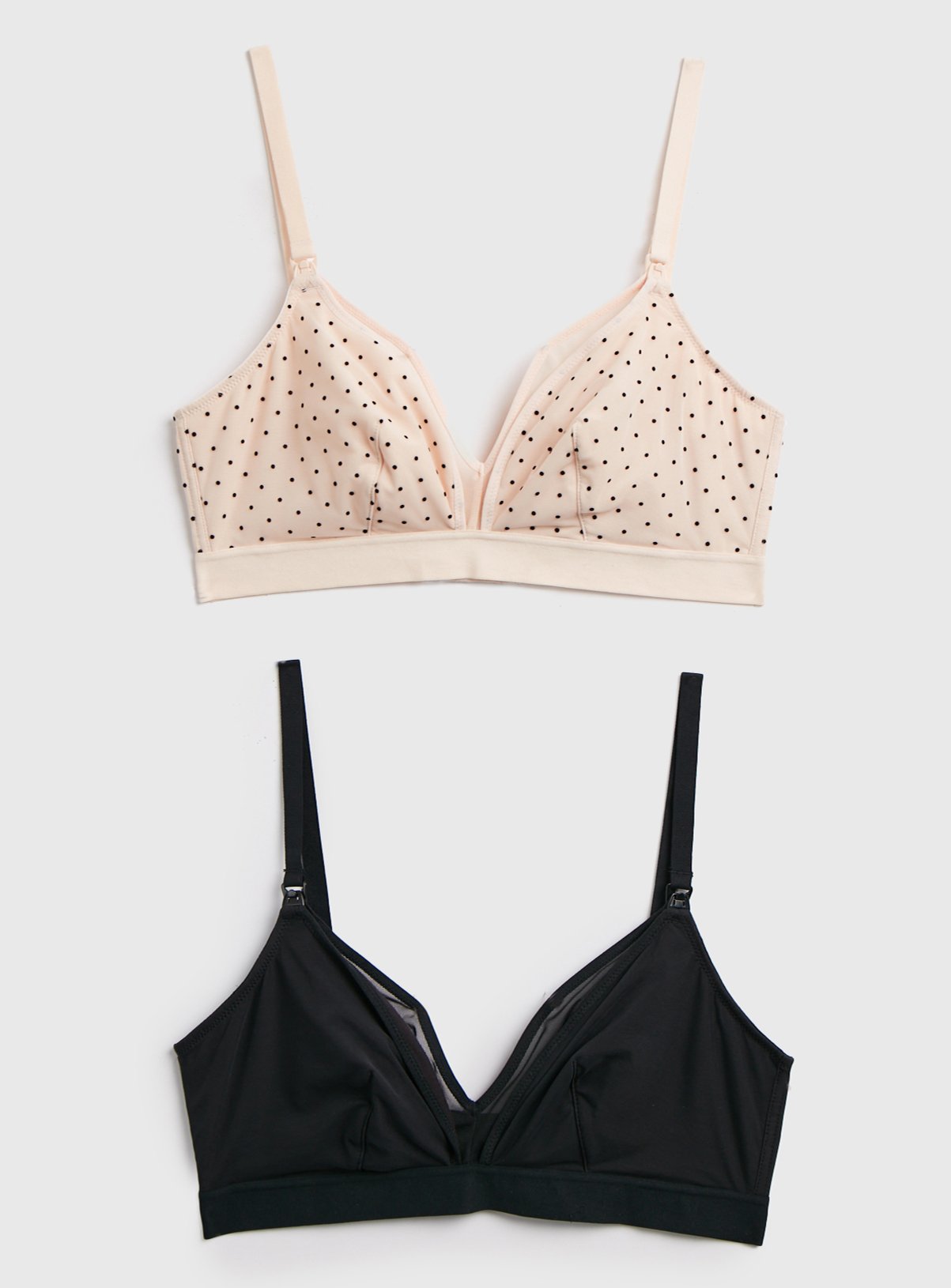 In black and baby pink with a flocked dot design, our maternity nursing bras are both pretty and practical in equal measure. With soft touch cups and pure cotton lining, they're non-wired with front clips for feeding, adjustable straps, and a feminine mesh inner layer for that extra touch of modesty and glamour. Mix and match with knickers from our full range of lingerie. Tu Maternity 2 Pack supersoft nursing bras 1 x Pink flocked dot 1 x Black Front clips Non wired Mesh detail Cotton lining Model's size is a 34C Model's height is 5'8" Keep away from fire