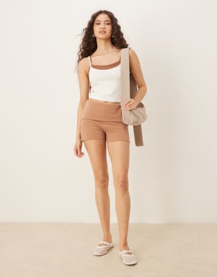 ASOS DESIGN fold over ribbed hot pant short in mocha-Brown