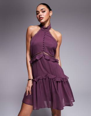 ASOS DESIGN lace insert halter tiered mini in aubergine-Brown