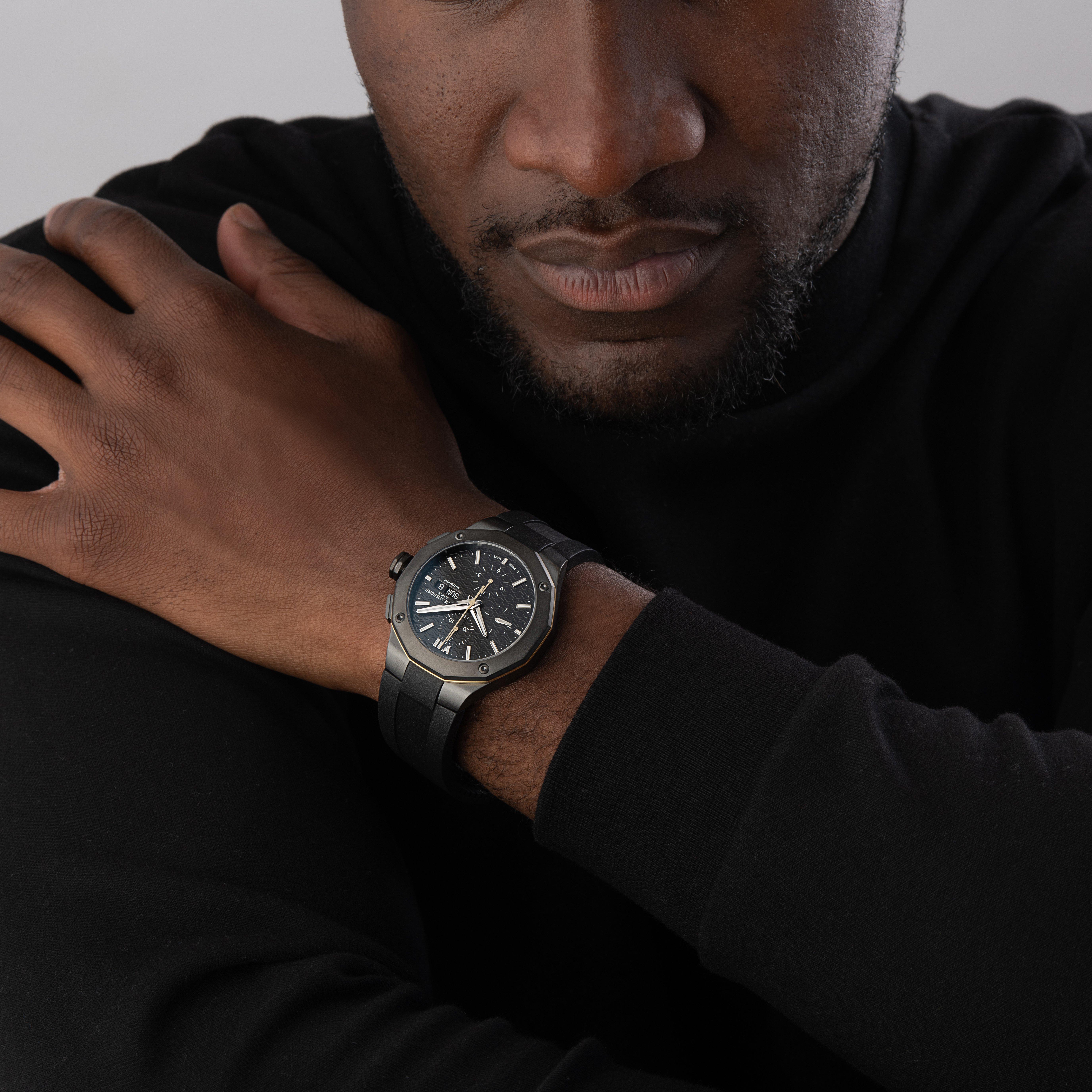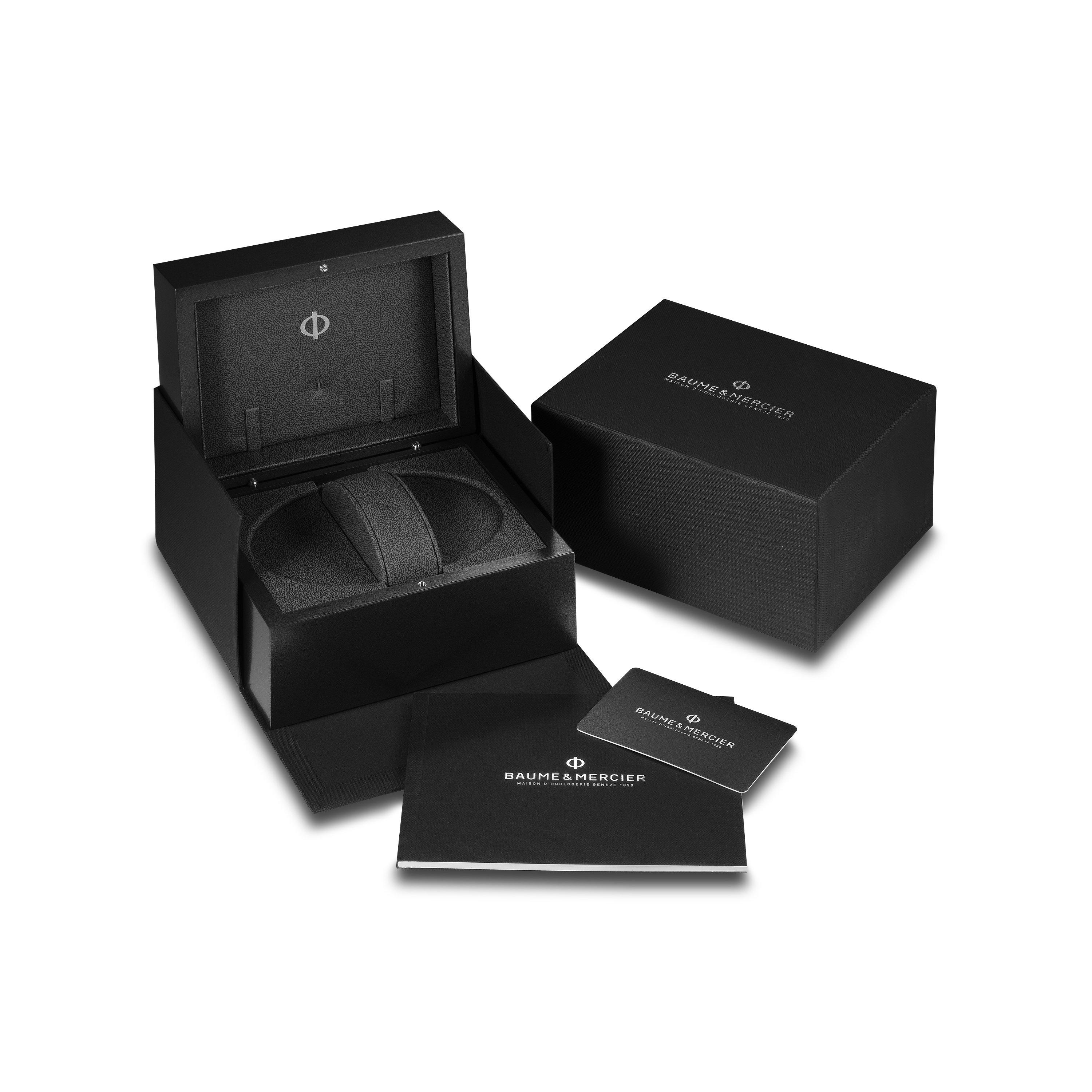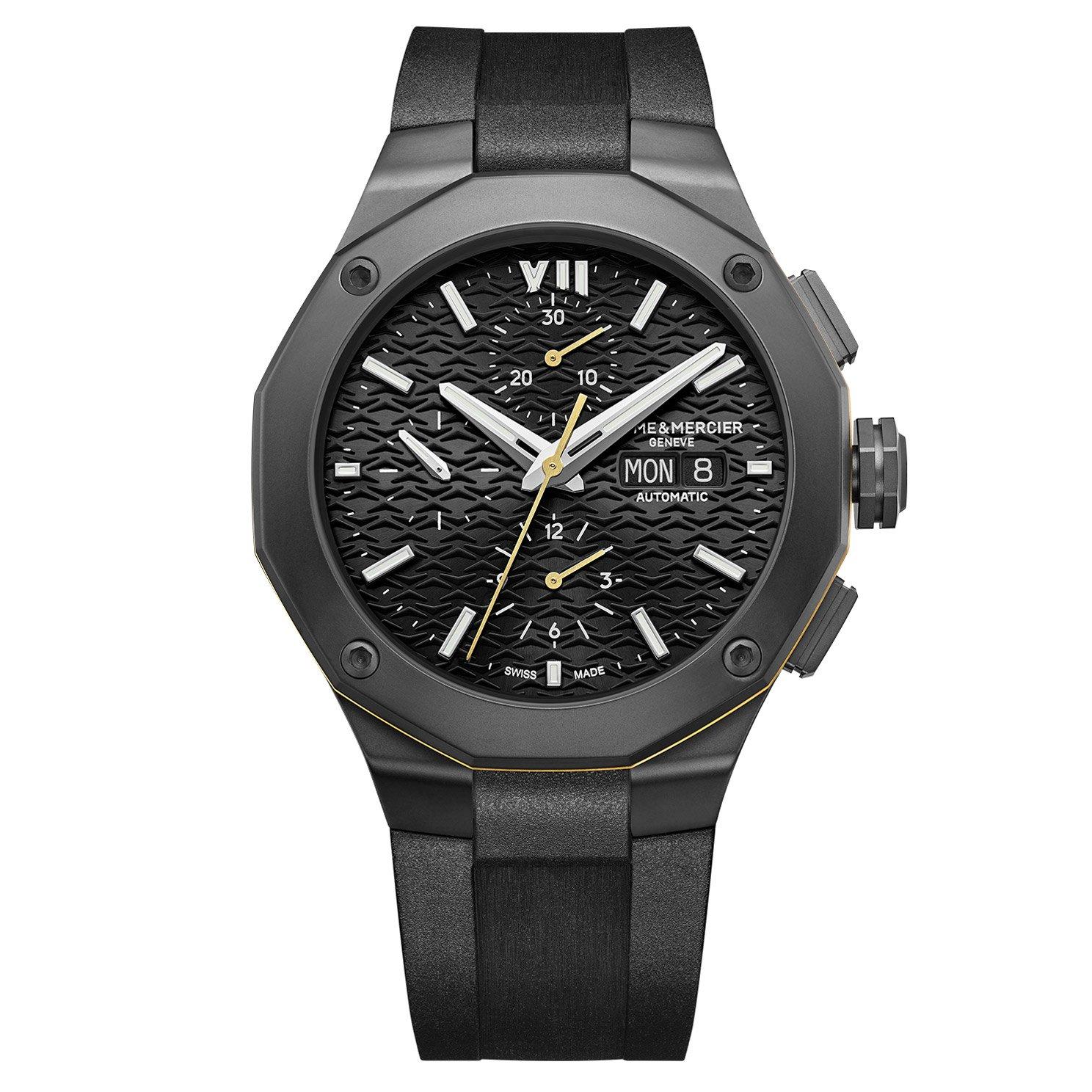 A confident companion for the everyday adventure, this Baume & Mercier Riviera Chronograph Automatic Mens Watch effortlessly fuses together high-performance with contemporary design. Crafted with a black sun satin-finished dial paired with a black rubber strap, this timepiece fits perfectly with the brands chronographs tradition. At A Glance Presented on a rubber strap and finished with a buckle 43mm case with 100m water resistance Black dial with stainless steel hands and hour markers Date window displayed at 3 o'clock Sapphire crystal glass Powered by an automatic movement