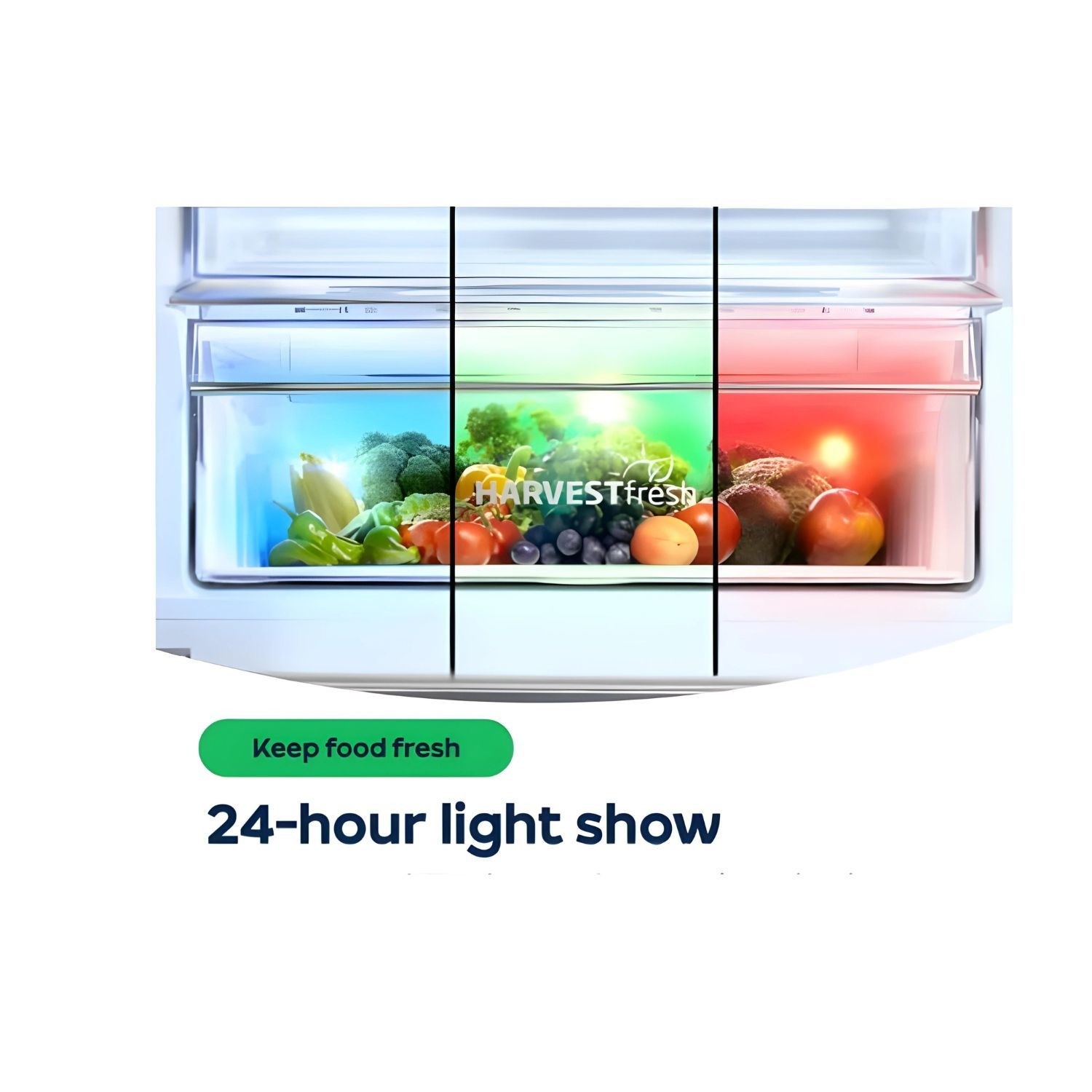 Stand out features HarvestFreshHarvestFresh™ . mimics the natural sunlight cycle. This helps fruits and vegetables stay fresher for longer preserving their vitamins and nutrients.. It's like having a mini garden inside your fridge ensuring your produce stays delicious and healthy for days! Frost FreeFrost free tech prevents ice buildup automatically. This . eliminates the need for manual defrosting. which saves you time and effort. Reversible DoorReversible doors . allow you to swap the hinges and handles. so the door opens from the opposite side for a perfect fit. Chrome Wine RackA chrome wine rack is a dedicated space to store y...