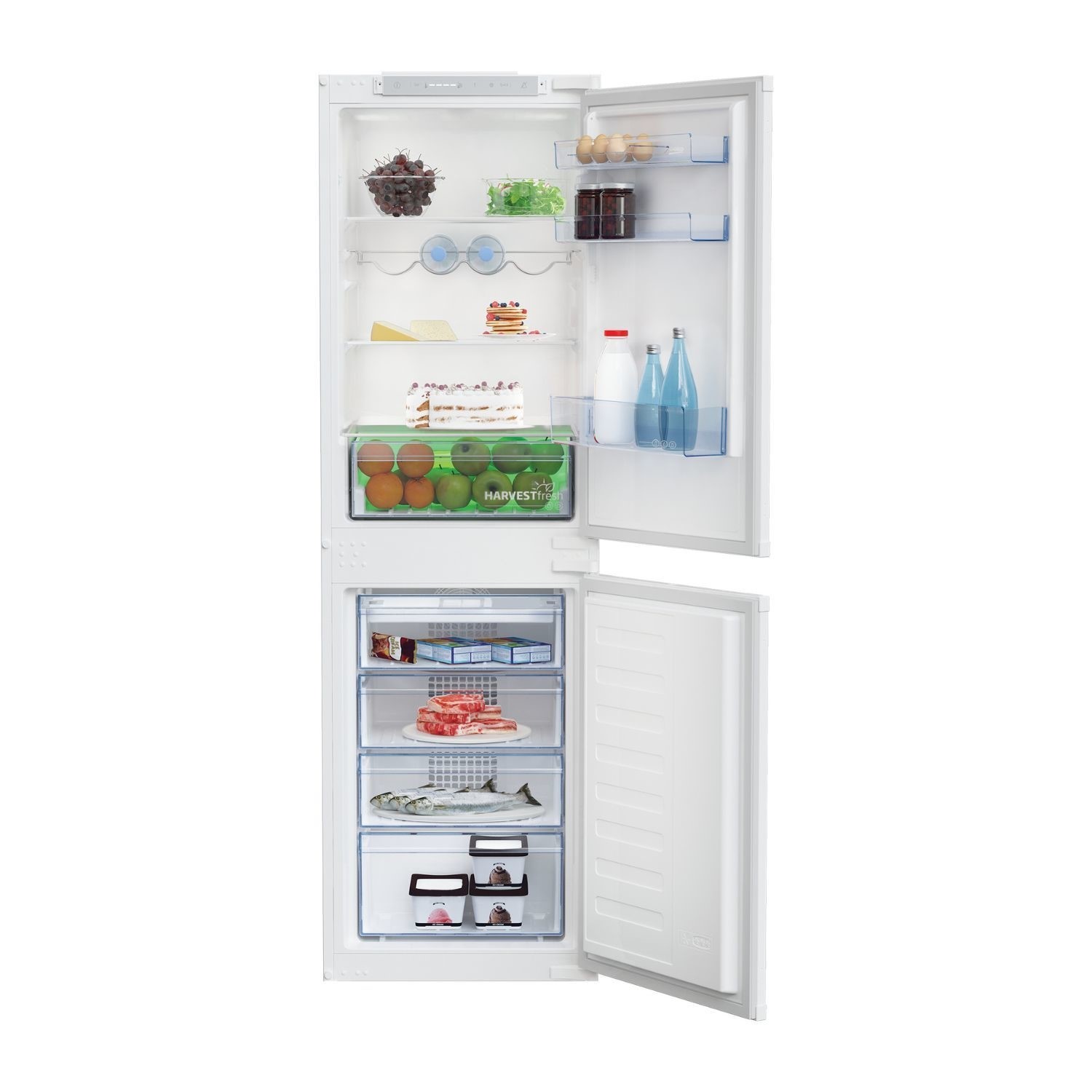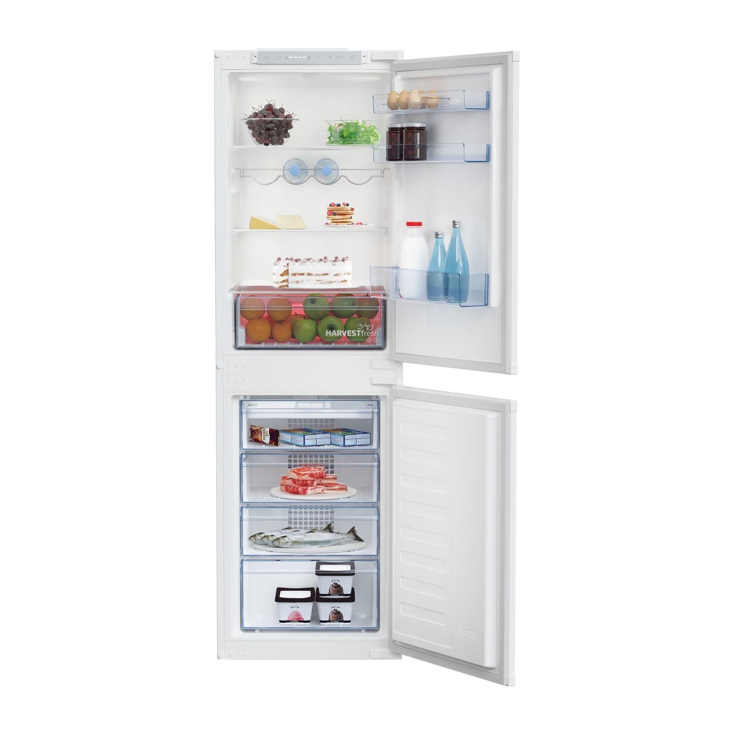 Stand out features HarvestFreshHarvestFresh™ . mimics the natural sunlight cycle. This helps fruits and vegetables stay fresher for longer preserving their vitamins and nutrients.. It's like having a mini garden inside your fridge ensuring your produce stays delicious and healthy for days! Frost FreeFrost free tech prevents ice buildup automatically. This . eliminates the need for manual defrosting. which saves you time and effort. Reversible DoorReversible doors . allow you to swap the hinges and handles. so the door opens from the opposite side for a perfect fit. Chrome Wine RackA chrome wine rack is a dedicated space to store your wine bottles. It . keeps them secure and at the perfect temperature while also freeing up space for other items.. This is perfect for wine lovers who want easy access to their favorite bottles all neatly organized and ready to enjoy. . The Beko BCFD4V50 Integrated 50/50 Frost Free Combi Fridge Freezer equipped with HarvestFresh™ Technology offers an innovative solution for keeping your food fresher for longer. This appliance is designed to seamlessly blend into your kitchen providing both functionality and style. Key Features . Capacity 254L total net capacity for ample storageDimensions 540mm (W) x 545mm (D) x 1775mm (H)Energy Efficiency Class E generally more energy-efficient than older appliancesNoise Level Quiet operation at 38 dBFrost Free Eliminates the need for manual defrostingHarvestFresh™ Technology Fruits and veggies stay fresher for longerFast Freeze For rapid cooling ensuring your fresh items stay crisp and deliciousReversible Doors Useful for flexibility in kitchen design and layout . Integrated DesignThis fridge freezer is crafted for perfect integration into your kitchen offering a sleek look without sacrificing its functionality. It blends seamlessly with cabinetry enhancing the overall aesthetic of your space. Chrome Wire Wine RackAn elegantly designed storage feature this rack optimizes space while ensuring your wine bottles are stored under ideal conditions ready for any occasion. Door Open AlarmA practical safety feature that alerts you if the door remains open preventing energy waste and ensuring your food stays chilled under optimal conditions. LED LightingThe interior is illuminated with LED lights providing a clear view of your fridge contents while being energy-efficient making it easier to find what you need without wasting electricity. Adjustable Glass ShelvesThese shelves can be adjusted to fit groceries of various sizes offering the flexibility to organize your fridge space efficiently and accommodate all your storage needs. Large Salad CrisperDesigned to keep your fruits and vegetables fresh for longer periods this drawer ensures your produce stays crisp and nutritious enhancing your healthy eating habits. . .