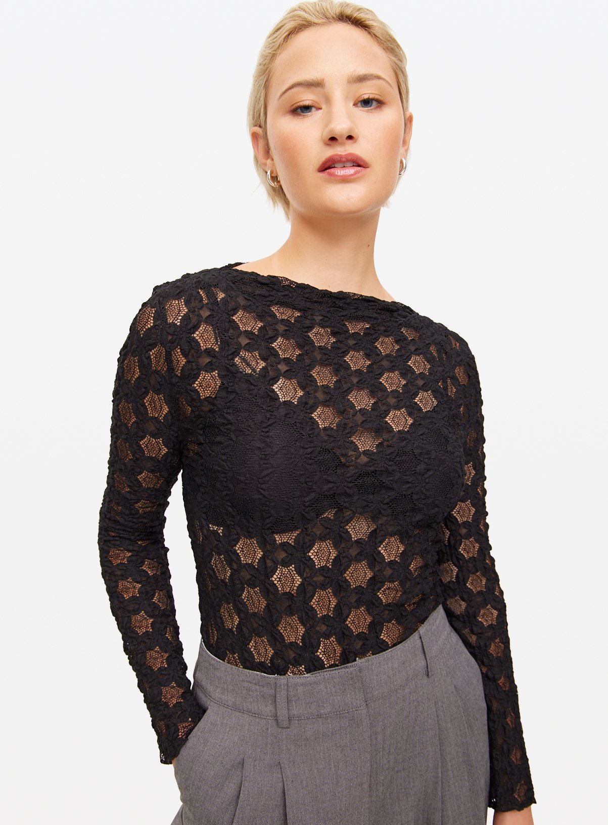 Introduce elegant styling to your capsule collection with our black top. Made in a lace fabric, it features a distinctive boat neckline and long sleeves. Dress it up or down depending on the occasion. Lace detailing Long sleeve Crafted with added stretch Model wears size 10 and is 5'9"