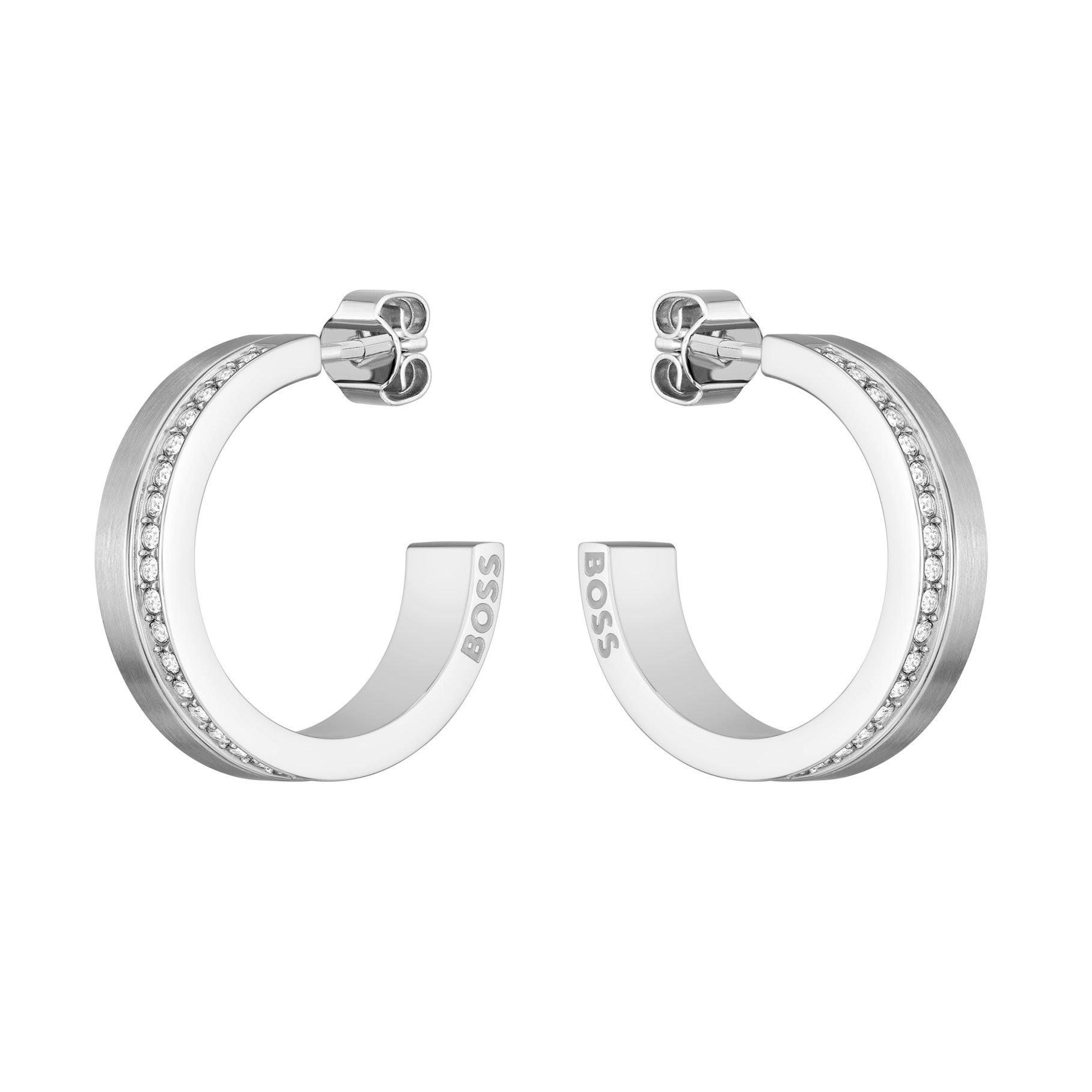 Effortlessly transition from day to night with these BOSS Silver Crystal Hoop Earring. Boasting sophisticated style with a designer sparkle that will show off your style. At A Glance Crafted in stainless steel BOSS logo branding Crystal design