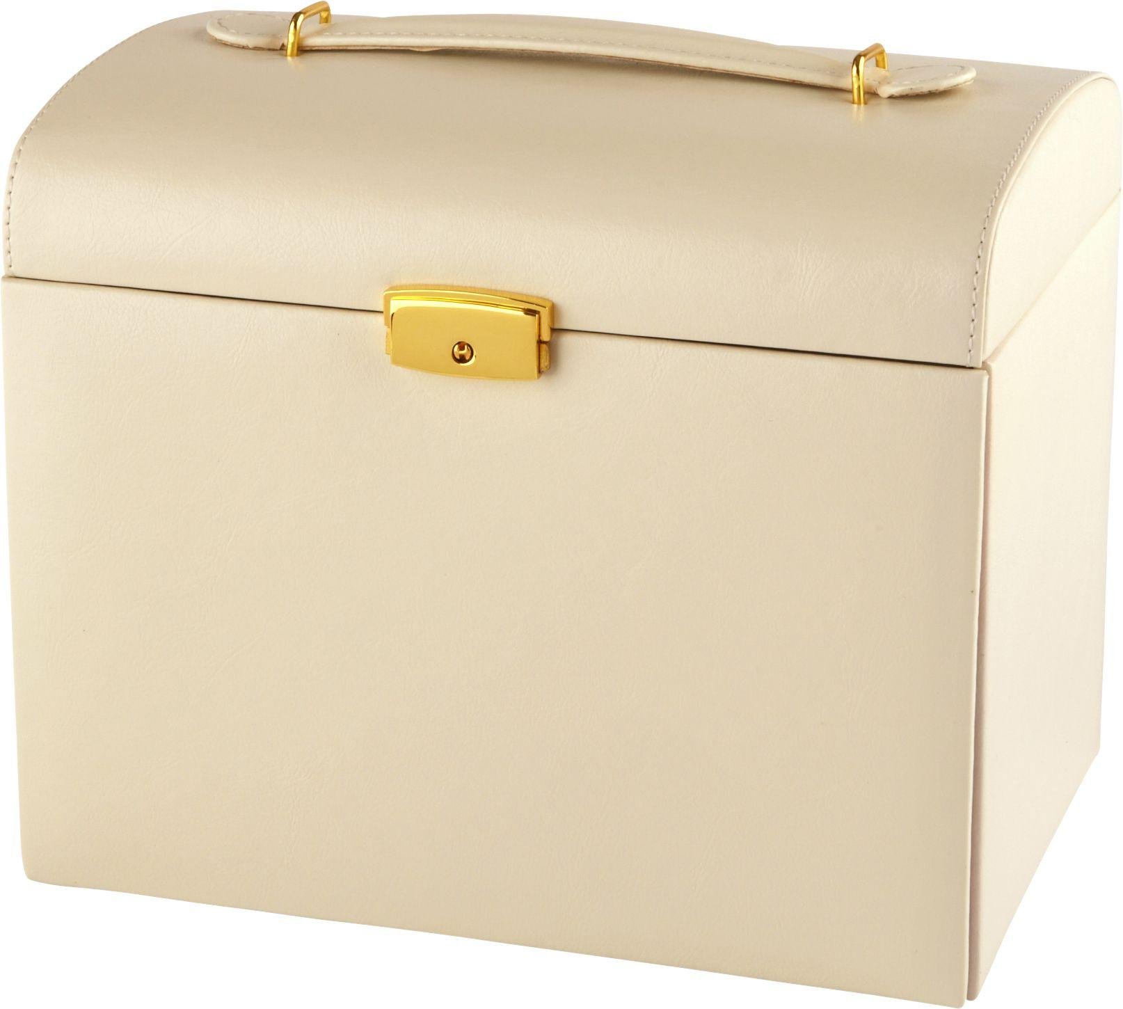 This large luxury cream jewellery box will be all the storage you will ever need for your charm collection. Lift the lid to discover four layers of compartments including individual drawers with brass style handles and impressive side doors to hide your necklaces. Faux leather exterior. 3 drawers. Fully lined interior. Lockable, . Size H21.8, W26, D18cm. Manufacturer's 1 year guarantee.