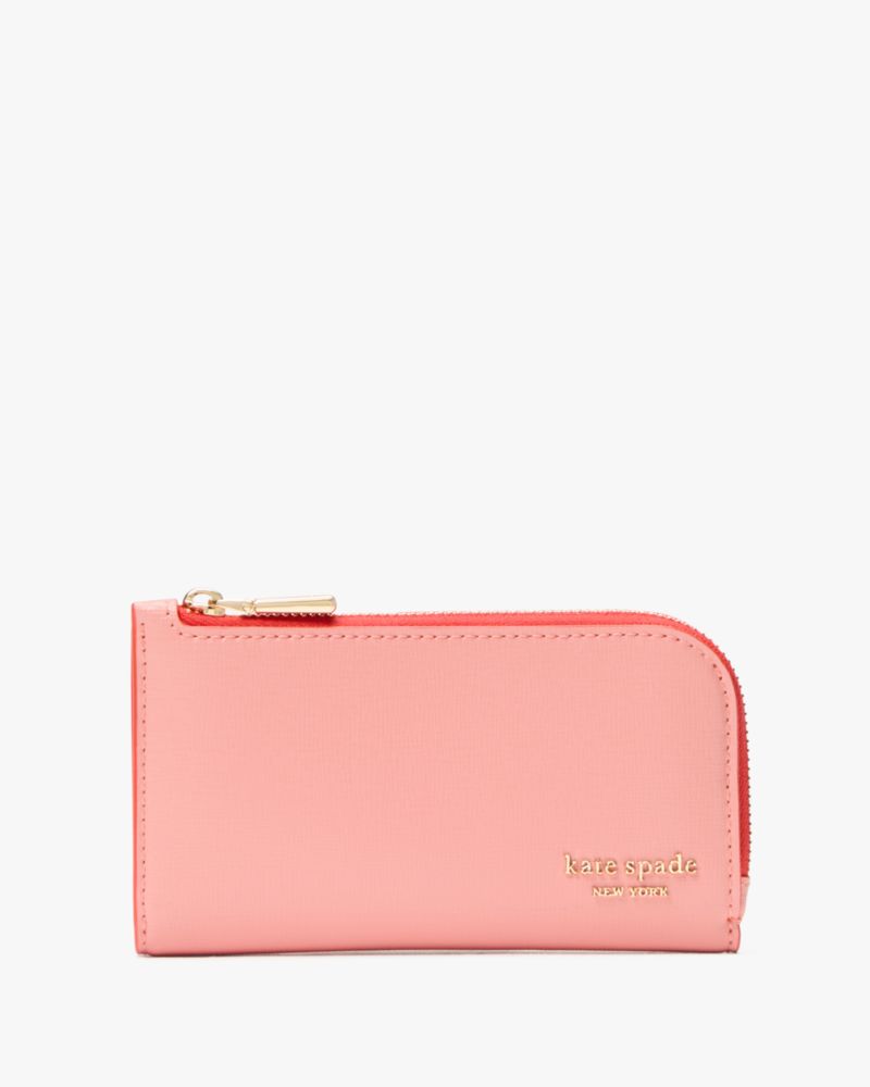 You'll reach for our Devin slim wallet on repeat. It's made from Saffiano leather, so it'll last-and look gorgeous-for years to come. We finished this one with a bright trim-because who doesn't love a pop of color? Kate Spade Women's Devin Pop Trim Small Bifold Wallet in Setting Sun/Orange Grainy Leather