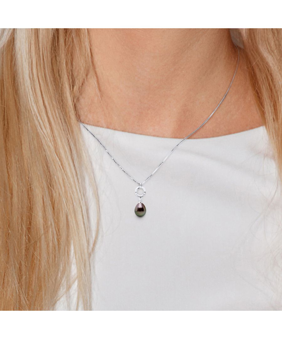 Necklace 0,01 Cts ( 3 x 0,0035 cts ) White Gold and true Cultured Tahitian Pearl Pear Shape 8-9 mm , 0,31 in - Our jewellery is made in France and will be delivered in a gift box accompanied by a Certificate of Authenticity and International Warranty