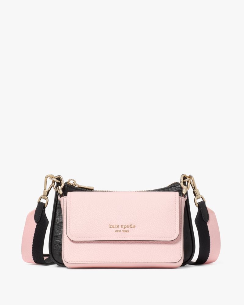 Proof that two is better than one. Our Double Up crossbody includes an optional Saffiano leather pouch that you can wear with the bag (or use on its own). Kate Spade Women's Double Up Colorblocked Crossbody Wallet in Pastry Pink Pebble Leather