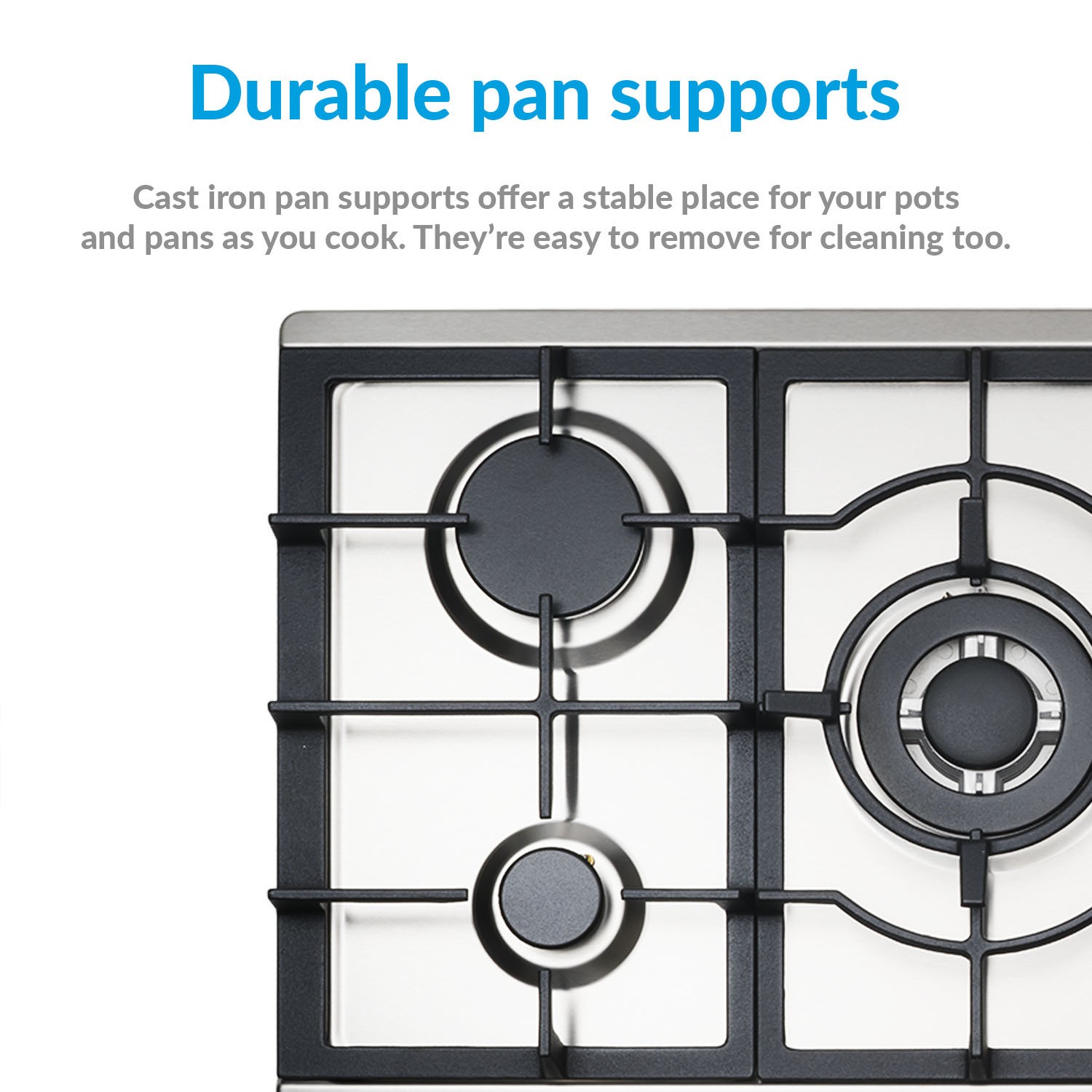 . What stands out . Super smooth stainless steel surface looks fantasticThere's plenty of space between the burners so you can use a wide range of cookwareFlame failure safety devices cut off the gas if your flame goes outIt's really easy to wipe clean after each useCast iron pan supports give you stability and are easy to lift away for cleaning The details This hob gives you efficiency in your kitchen helping you to cook dishes and meals more smoothly and with more precision. With an extra burner you've got the extra space for cooking everything from tea on a weekday to a big family get-together. It's the perfect hob for medium to ...