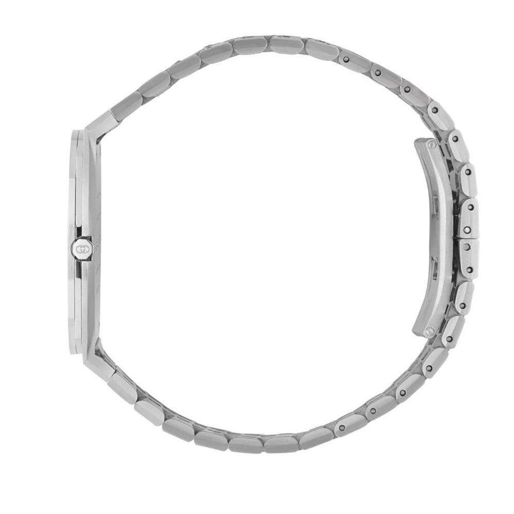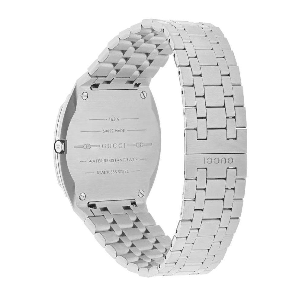 The launch of the new Gucci 25H highlights the progressive and innovative vision of the brand. A gender-neutral, super sleek design embellished with a halo of diamonds makes this Gucci 25H Diamond Watch both iconic and relevant for today's world. At A Glance Presented on a stainless steel bracelet 34mm stainless steel ultra-slim multi-layered case Silver brass dial with interlocking G motif Silver batons and hands Sapphire crystal glass with anti-reflective coating Water resistance of up to 30m Powered by Swiss made quartz movement