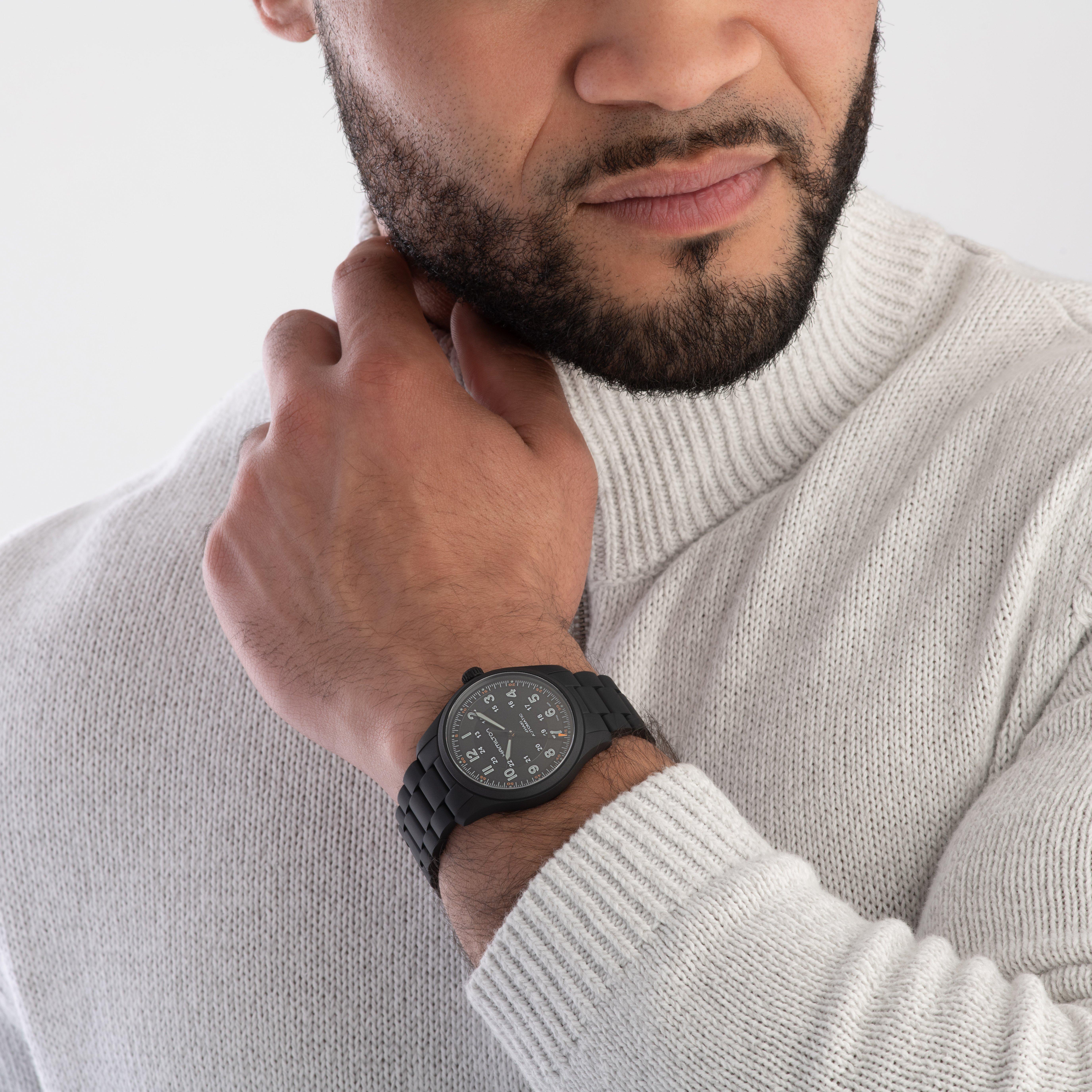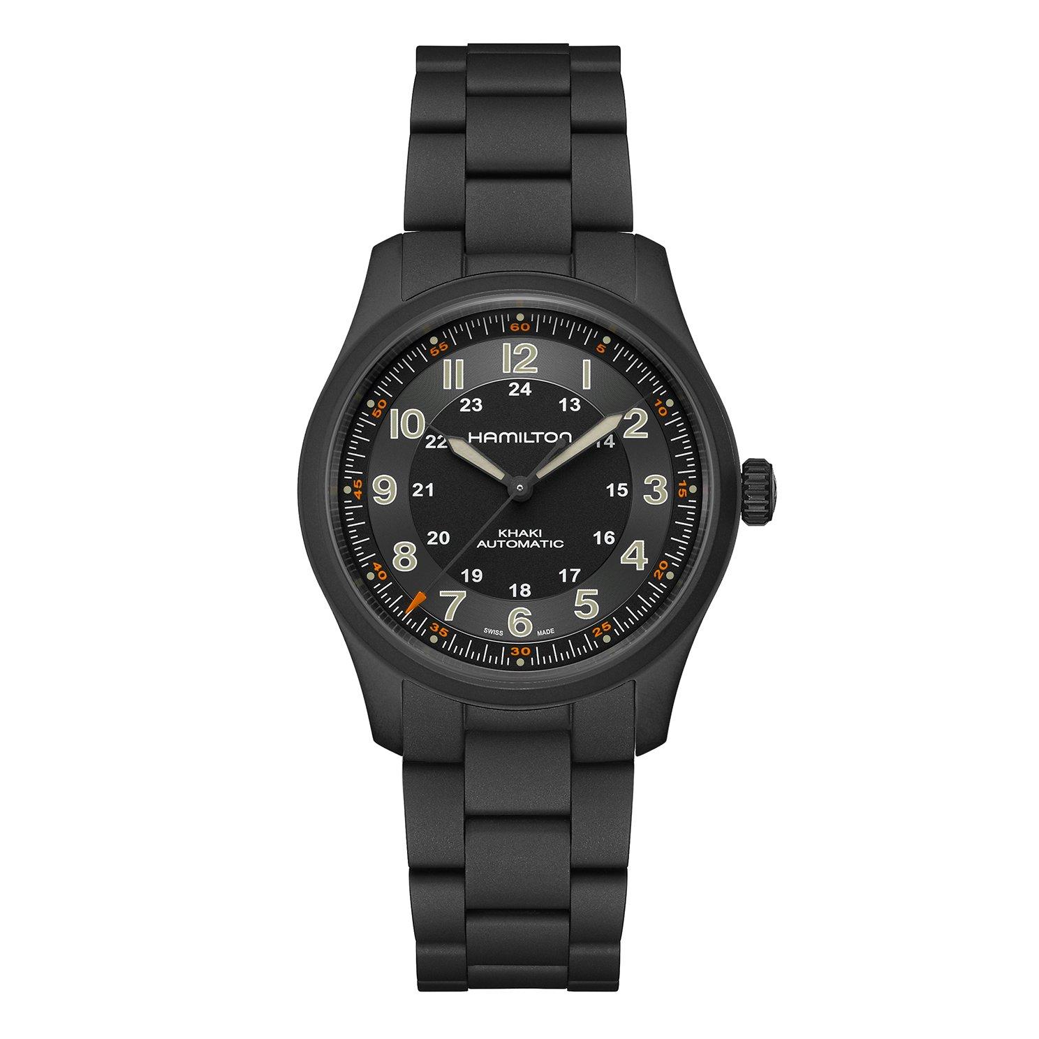 Built for every adventure, this Hamilton Khaki Field Titanium Automatic Watch features a black PVD coated titanium case and bracelet. Delivering a highly versatile timepiece, ideal for every occasion, this robust and reliable companion will keep you on track through every quest. At A Glance Presented on a black PVD coated titanium bracelet and finished with a foldover clasp 38mm case with 100m water resistance Black dial with stainless steel hands and hour markers Sapphire crystal glass Powered by an automatic movement