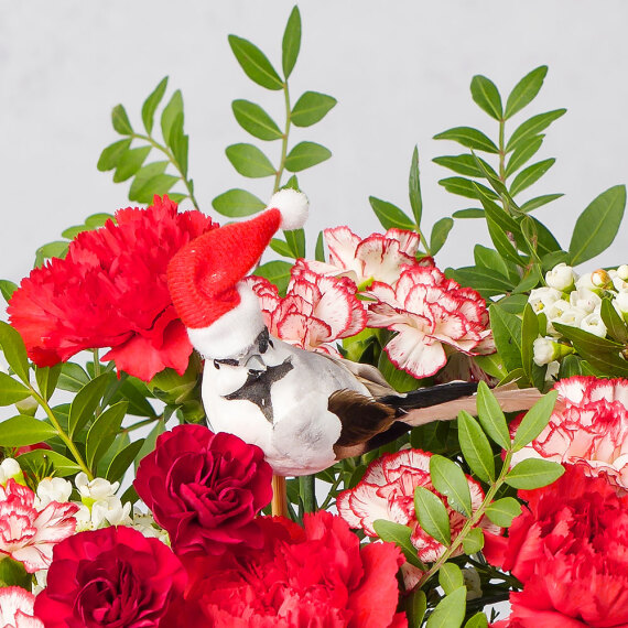 A Christmas selection of long-lasting Carnations and Spray Carnations in rich red and two-tone red and white with delicate white Waxflower. Finished with festive Hypericum Berries and a keepsake Christmas bird pick.