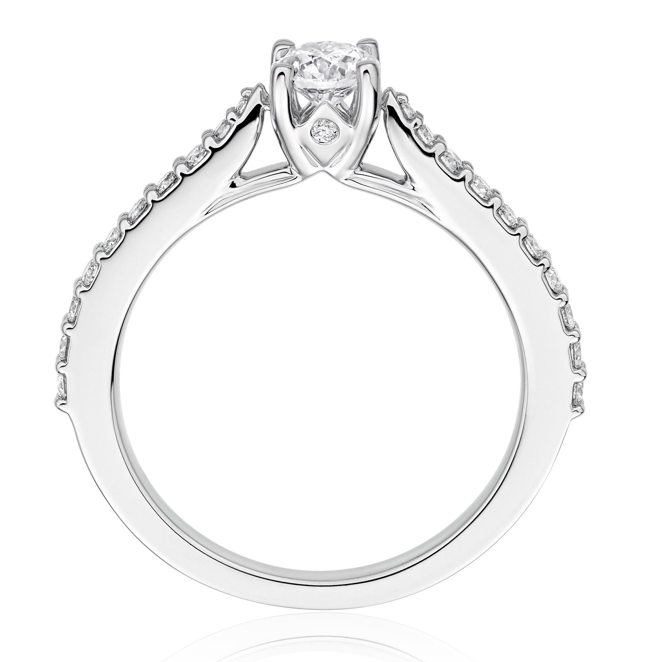 Dazzling from every angle with the most breathtaking sparkle, this Hearts on Fire Platinum Diamond Solitaire Ring is the perfect way to ask your loved one that important question. At A Glance Presented on a polished platinum band Diamond embellished shoulders Round brilliant central diamond in a four claw setting Diamond colour - H Diamond Clarity - SI1 Diamond carat weight - 0.43ct Please note there could be a 5% variance on the diamond carat weight, as every diamond is unique