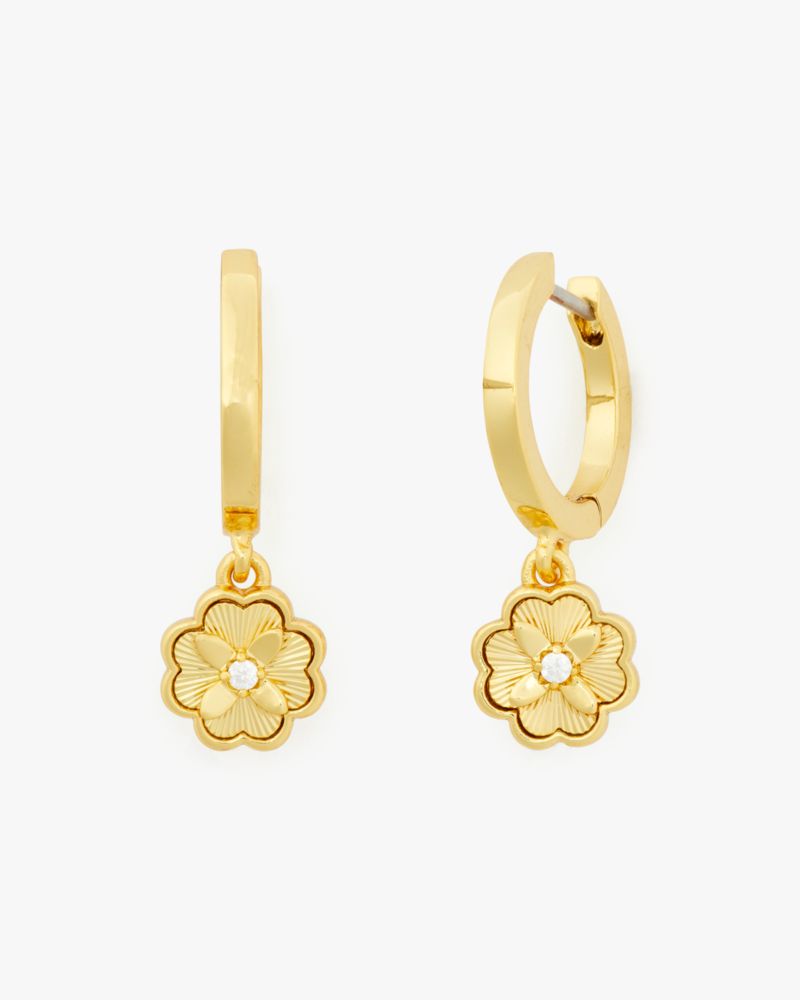 We've reimagined our signature spades as an elegant floral motif. Here, we used it on these classic huggies with sparkling accents. Kate Spade Women's Heritage Bloom Huggies Earring in Clear/Gold/Beige