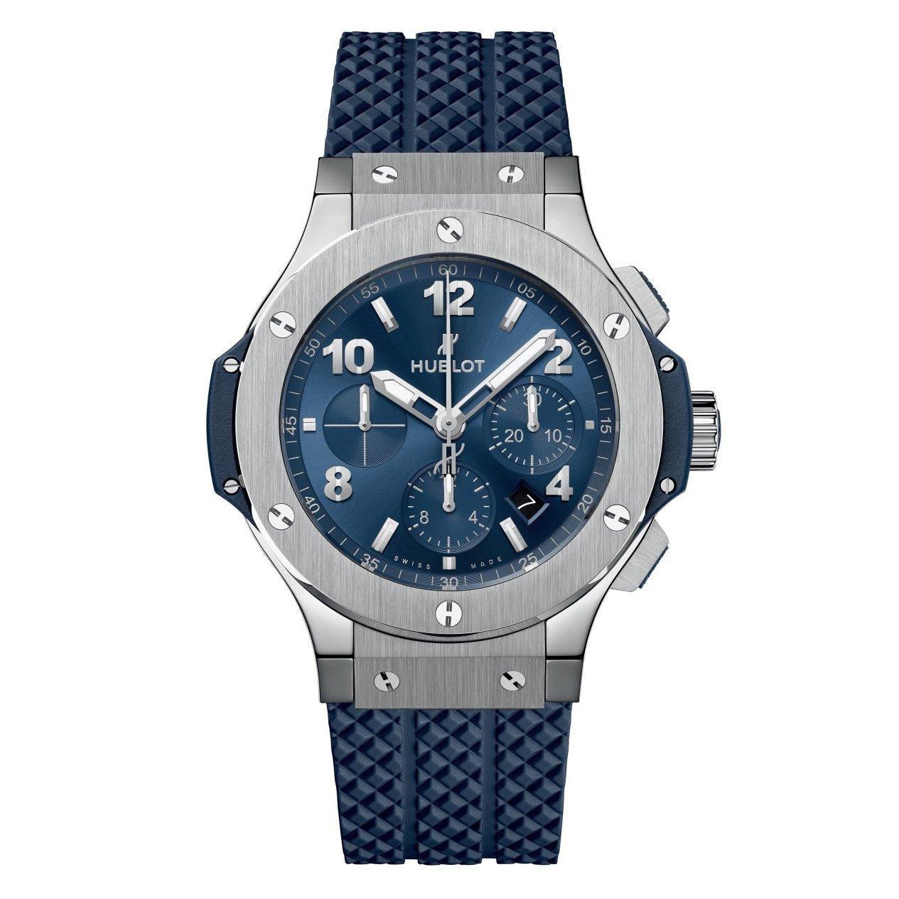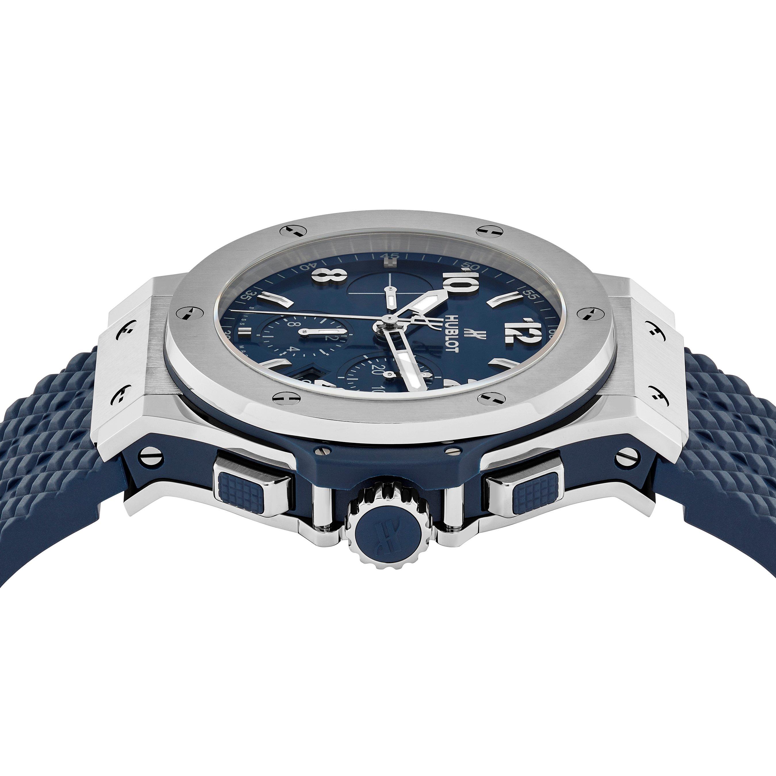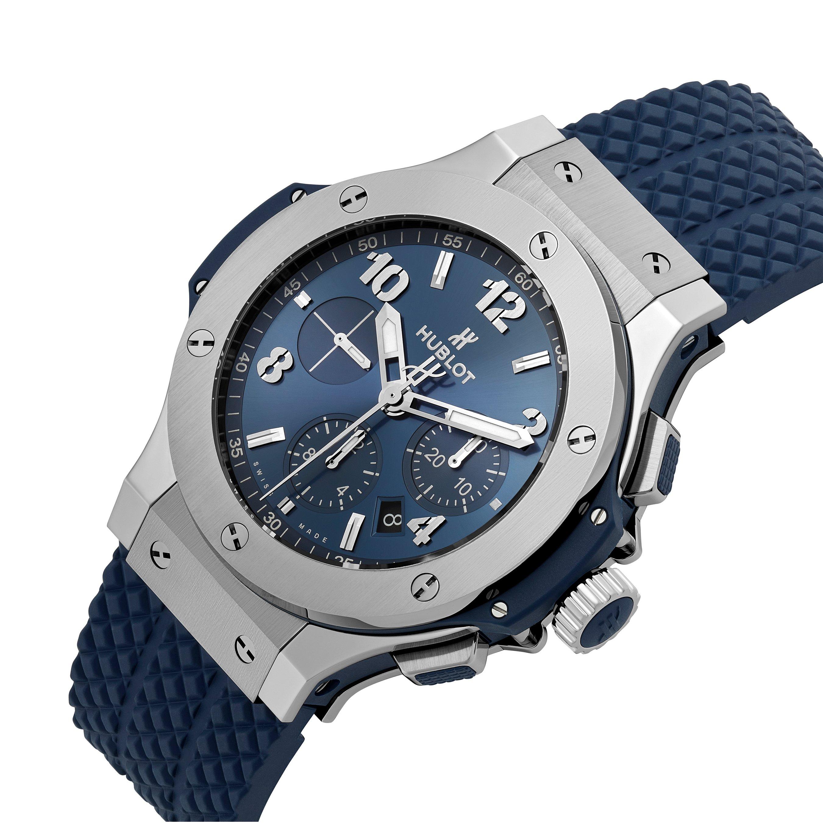Bold and powerful, this Hublot Big Bang Stainless Steel Blue Chronograph Men's Watch fuses together exceptional materials to create a sporty, robust and innovative timepiece. At A Glance Presented on a blue structured rubber strap fastened with a stainless steel deployment buckle 44mm bi-metal case with a 100m water resistance Blue dial with stainless steel hands and hour markers Chronograph function Date window between 4 and 5 o'clock Sapphire crystal glass Powered by a mechanical movement