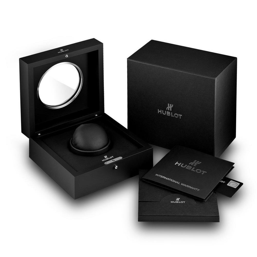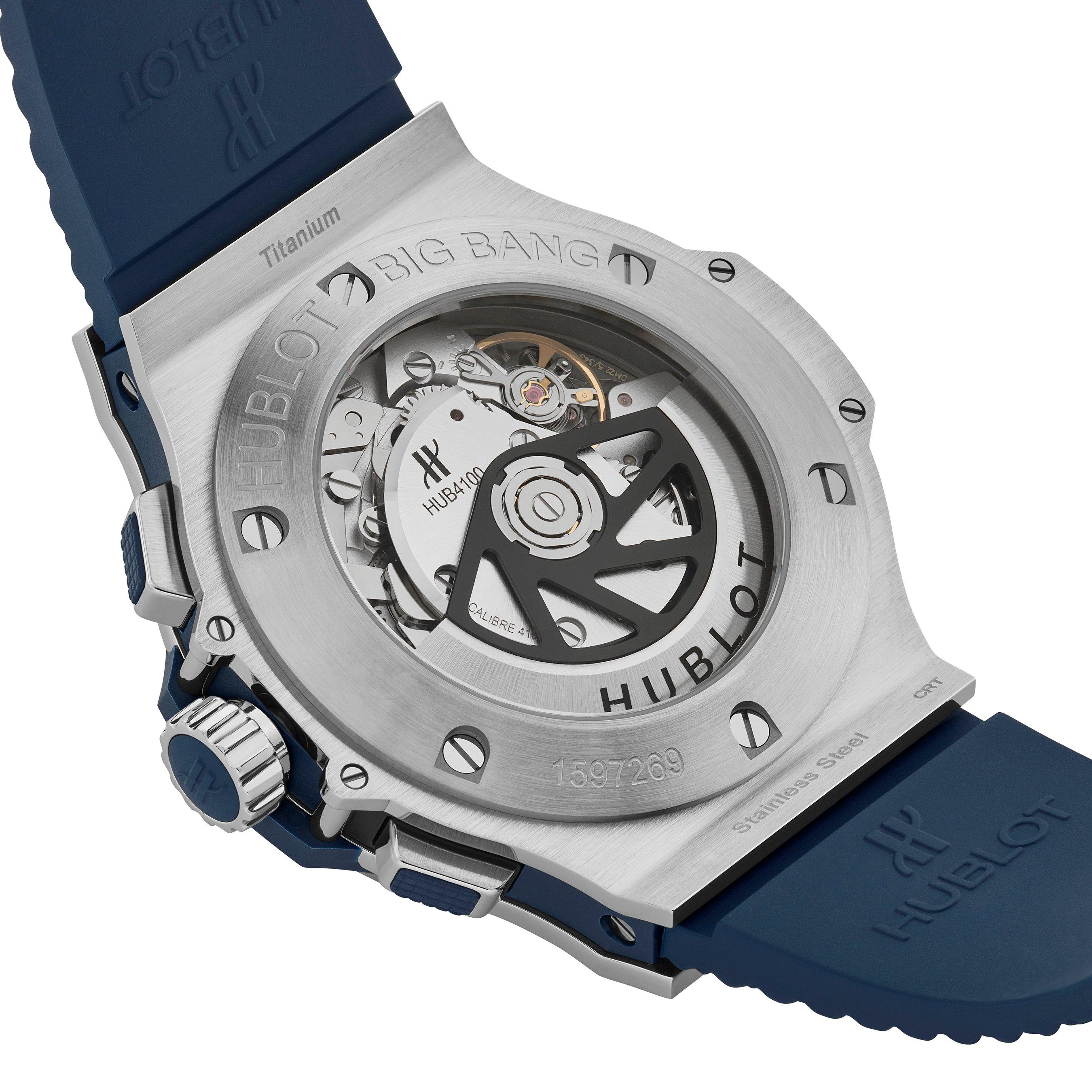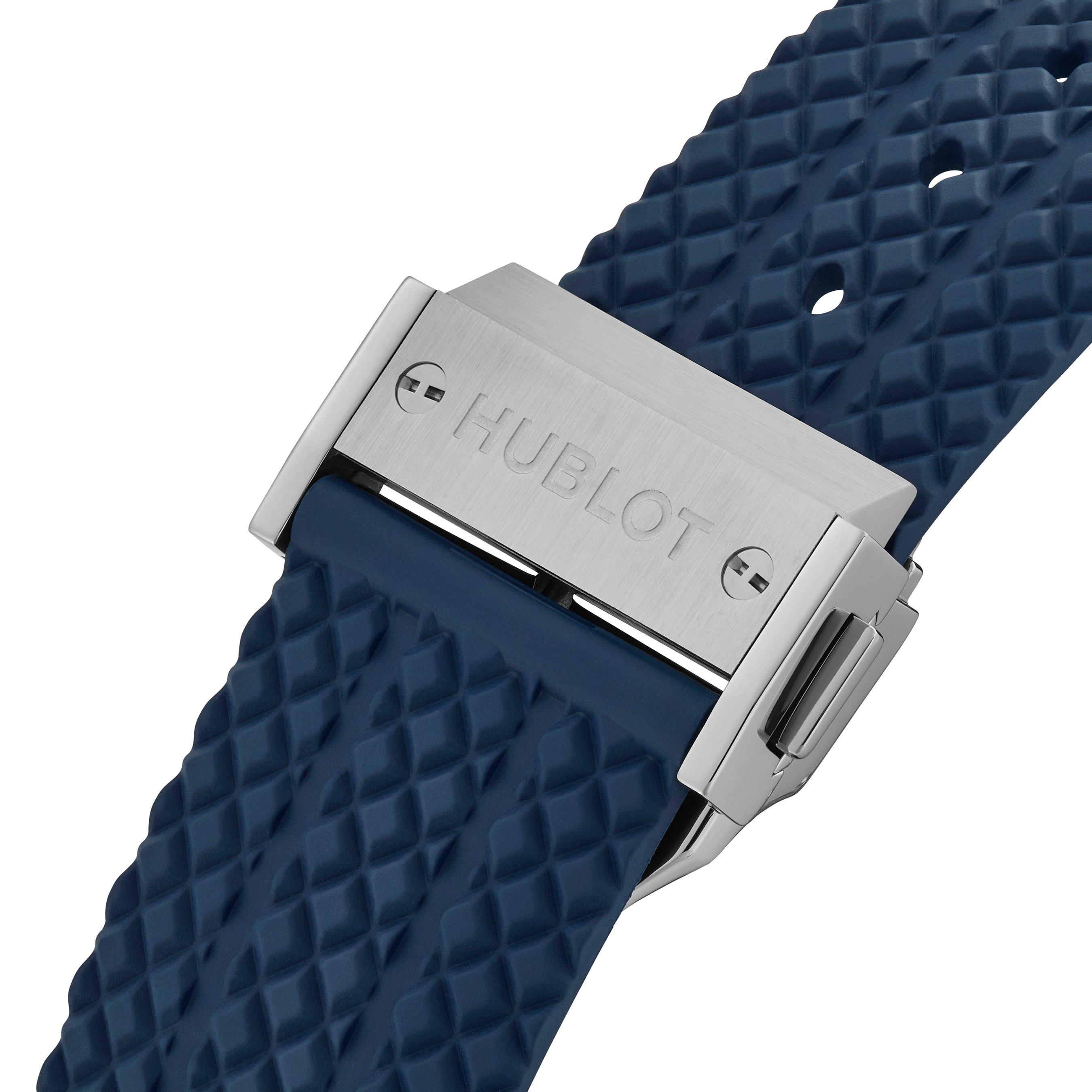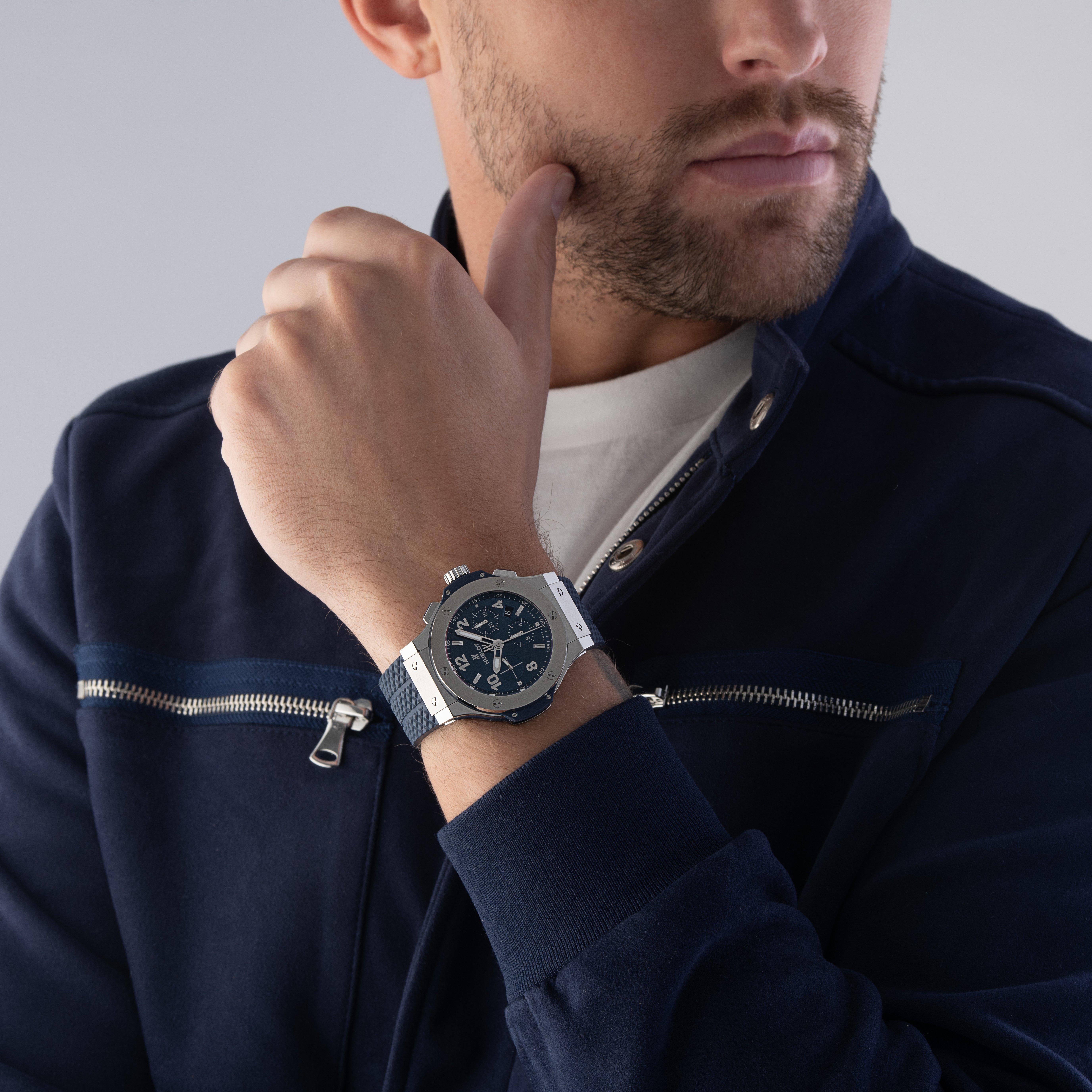 Bold and powerful, this Hublot Big Bang Stainless Steel Blue Chronograph Men's Watch fuses together exceptional materials to create a sporty, robust and innovative timepiece. At A Glance Presented on a blue structured rubber strap fastened with a stainless steel deployment buckle 44mm bi-metal case with a 100m water resistance Blue dial with stainless steel hands and hour markers Chronograph function Date window between 4 and 5 o'clock Sapphire crystal glass Powered by a mechanical movement