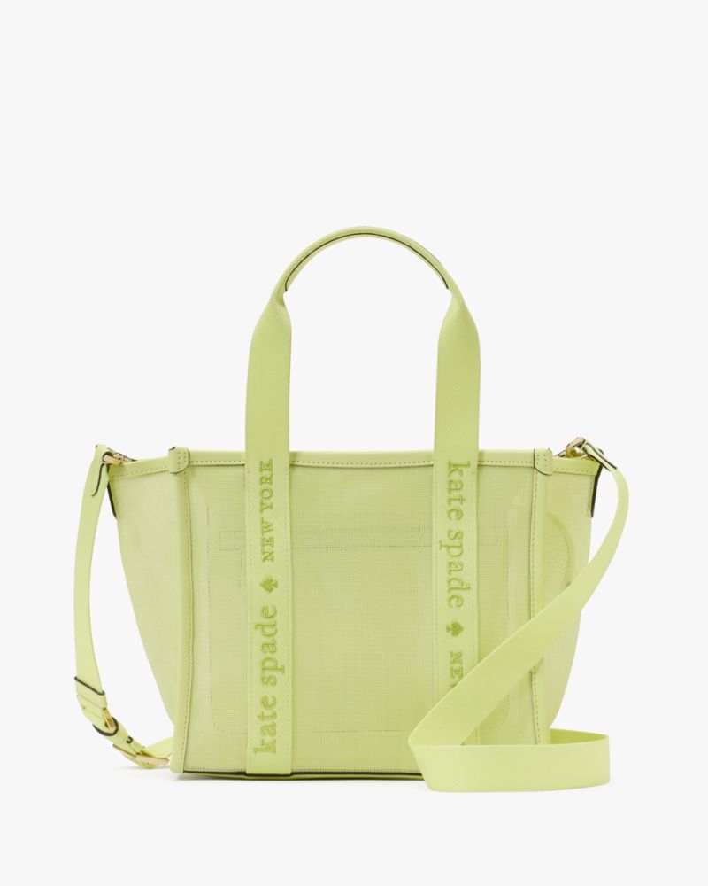 You know this tote holds your everyday stuff like a wallet, keys, phone, sunglasses. It also holds: two red lipsticks, $6 in change, 11 crumpled receipts, an avocado... Kate Spade Women's Kip Mesh Small Tote Bag in Melon Rind/Green Fabric