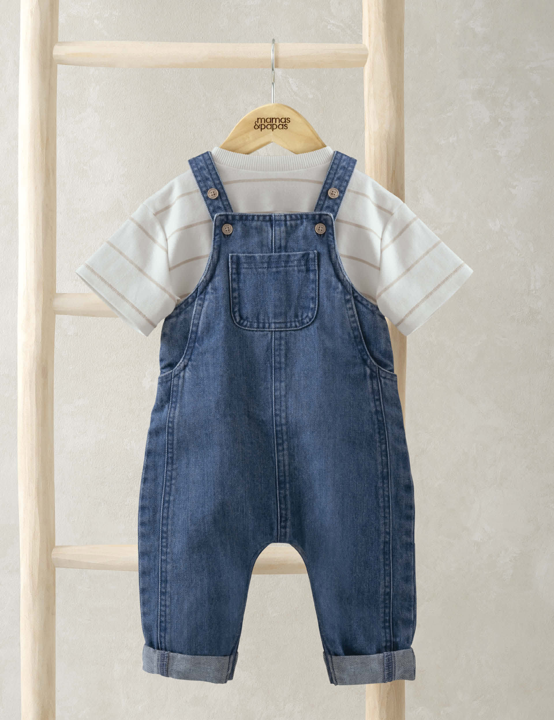 This two-piece, cotton-rich outfit from Mamas & Papas is perfect for everyday wear. The regular-fit set includes denim dungarees with adjustable shoulder straps. Topstitched seams, pocket detailing and turn-back cuffs create a cute look. A striped t-shirt with poppers at the shoulder for easier dressing, can be worn underneath.