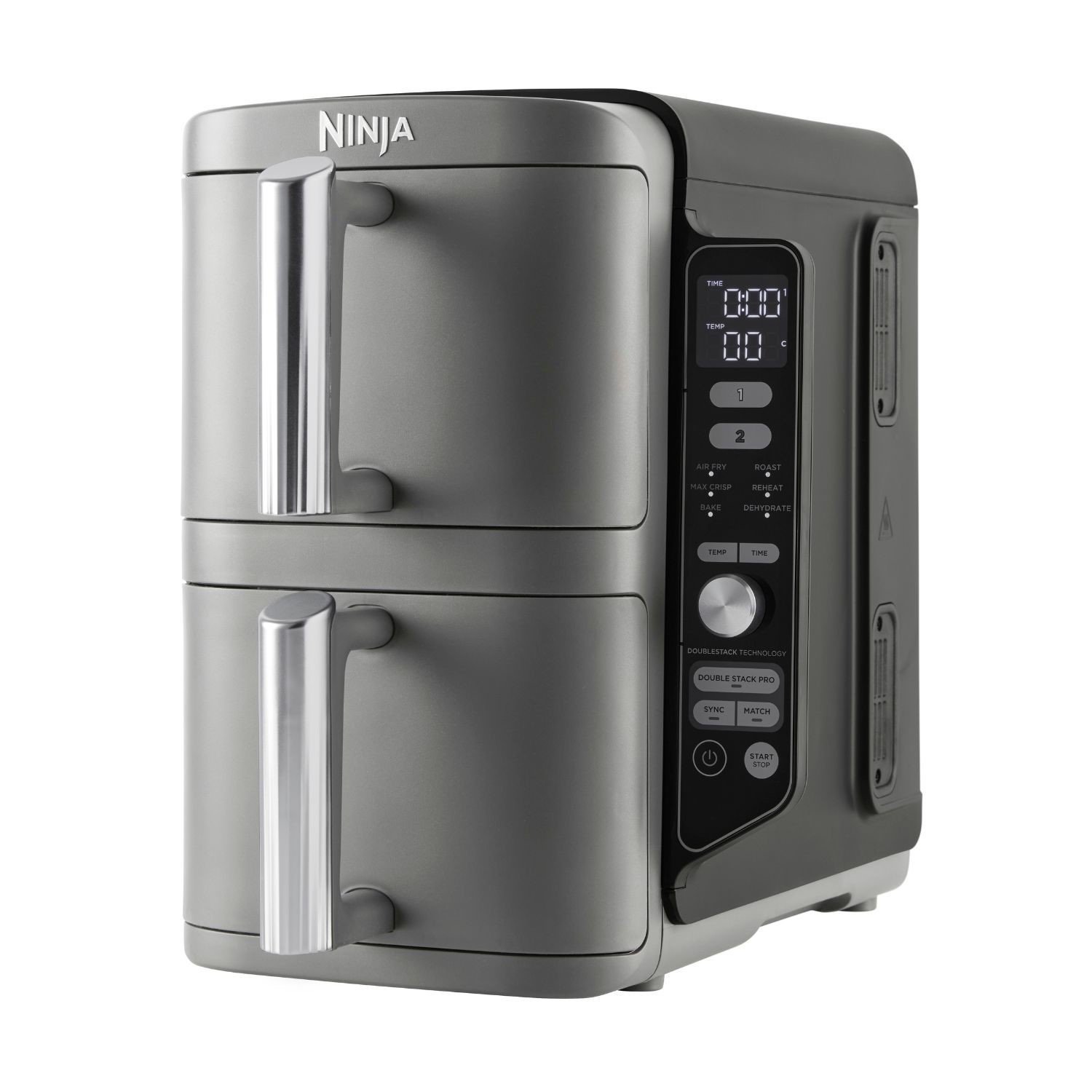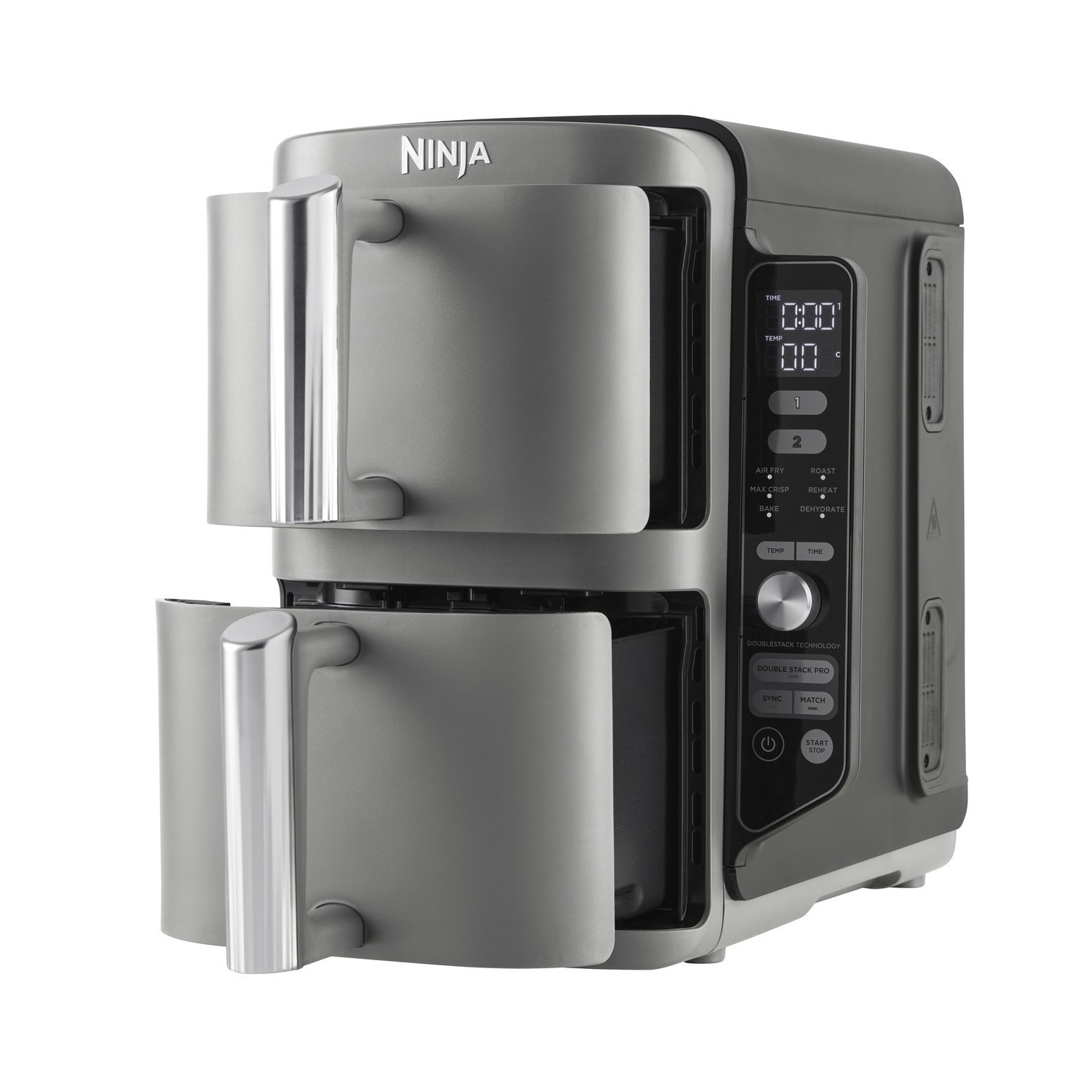 Standout Features Double Stack Air Fry TechnologyExperience smarter cooking with the . Ninja Double Stack XL Air FryerThis clever design features . 2 x 4.75L vertical stacked drawers. that deliver the . same generous capacity as a traditional dual-drawer air fryer. — while taking up less space on your countertop.At just . 38.5cm tall. it’s slim enough to . fit neatly under kitchen cabinets. helping you keep your worktops clear and clutter-free. Perfect for families and entertaining the Double Stack design lets you cook mains and sides together batch cook more in one go and enjoy healthier faster meals in a compact footprint. 6 Cooking FunctionsWith . 6 versatile cooking functions. the Ninja Double Stack XL makes it easy to find the perfect setting for every meal. Choose from . Air Fry Roast Bake Dehydrate Reheat and Max Crisp. to enjoy everything from crispy chips and juicy roasts to fresh-baked treats and healthy snacks.Thanks to . independent drawer controls. you can . mix and match cooking functions times and temperatures in each drawerThat means roasting chicken in one while crisping fries in the other — or baking a dessert while reheating leftovers. Whatever’s on the menu both drawers finish cooking at the same time so you can serve a complete meal without compromise. Cook 4 Foods at OnceCook more in less space with the . Stacked Meal Rack inserts. letting you prepare food on . 4 levels at the same timeThanks to . 360° air circulation. every bite comes out evenly cooked and perfectly crisp — no matter which level it’s on.Layer chicken nuggets over fries in one drawer while roasting salmon fillets with asparagus in the other and enjoy a complete family meal in one easy cook. Whether it’s weeknight dinners party platters or meal prep the . multi-level air fryer design. saves time energy and counter space. Feeds up to 8 PeopleCook family dinners faster and easier with the Ninja Double Stack XL. This . dual drawer air fryer. cooks meals up to . 55% faster than fan ovens. so you can get dinner on the table in no time. Each spacious drawer fits a . whole 1.4kg roast chicken. making it perfect for . large families meal prepping or entertaining guests. .With the clever . SYNC function. you can set different cooking times temperatures and functions in each drawer — and still have both finish at the same time. That means mains and sides are always served hot fresh and ready together. Ninja Double Stack XL 2-Drawer Air Fryer – Slim Spacious and; Energy EfficientOnly Ninja brings you . Double Stack Air Fry Technology. – giving you the same generous capacity as traditional dual-drawer models but in a design that’s . 30% slimmer than the AF400Perfect for kitchens where counter space matters the . Ninja Double Stack XL air fryer. makes it easy to cook more while taking up less room.Not only is it space-saving it’s also . energy-efficient. using up to . 55% less energy than a conventional oven†That means faster meals lower bills and healthier results with little to no oil.Cleaning is effortless too – the . non-stick drawers crisper plates and wire racks are dishwasher-safe. so you spend less time scrubbing and more time enjoying your food.For added peace of mind every Ninja Double Stack XL comes with a . 2-year guarantee upon registration. (UK and; ROI only). Why Choose the Ninja Double Stack XL? 30% Slimmer Design. – saves counter space without losing capacity. Double Stack Technology. – cook multiple layers of food evenly. Energy Smart. – up to 55% l