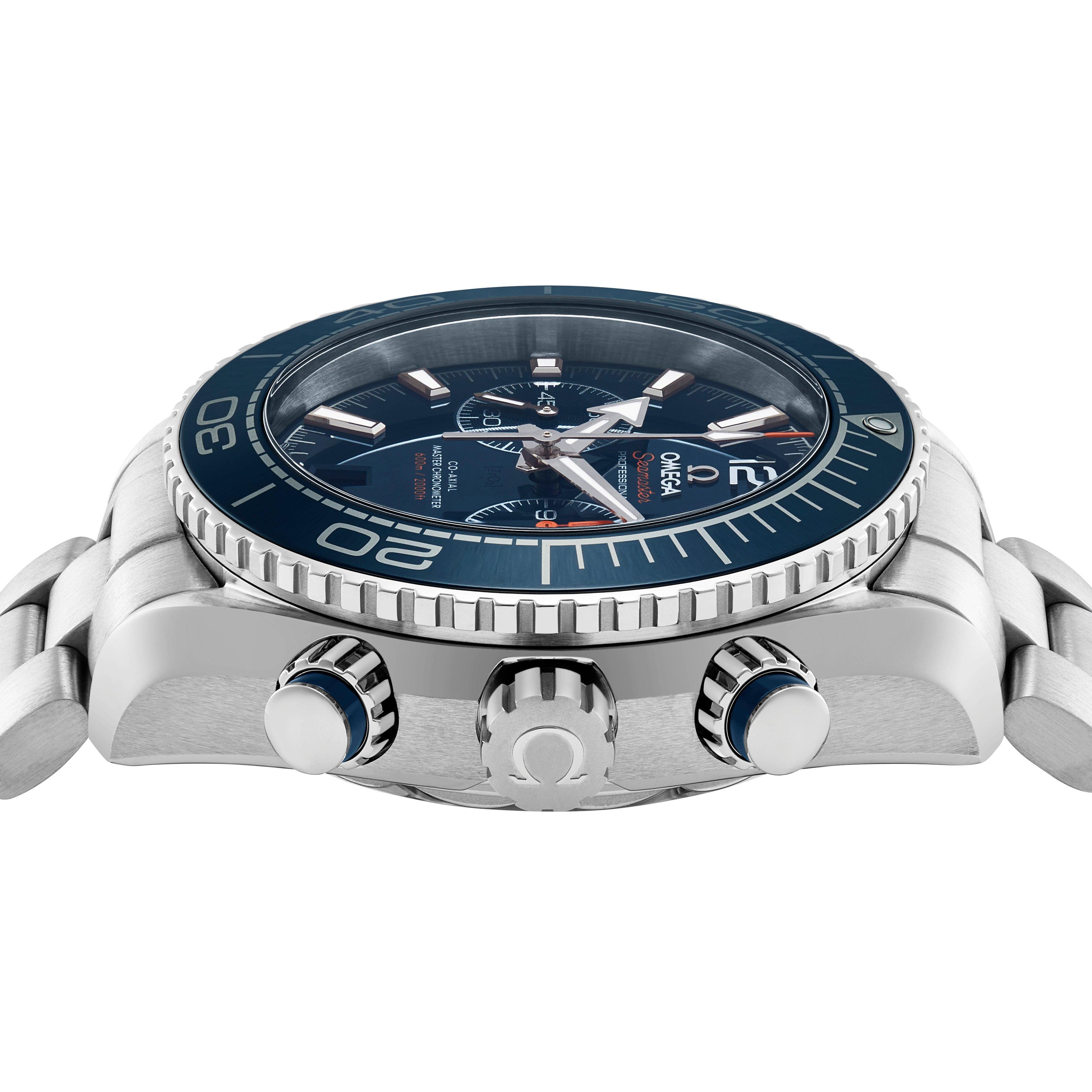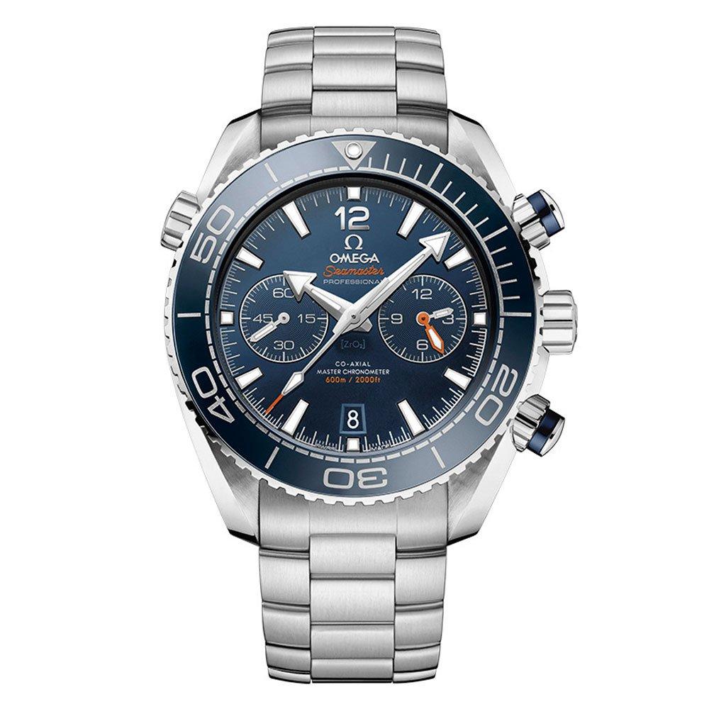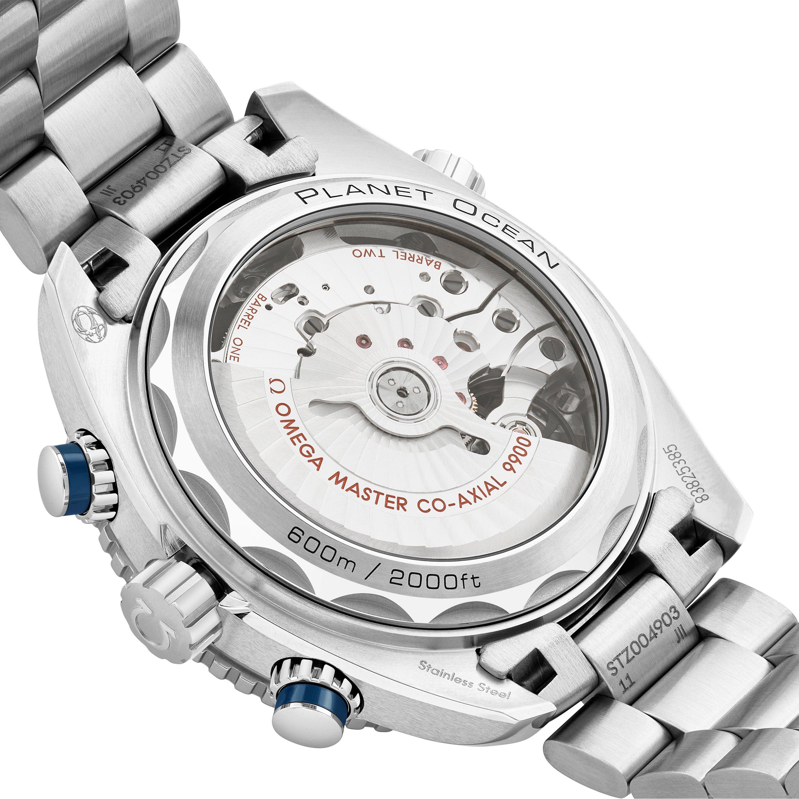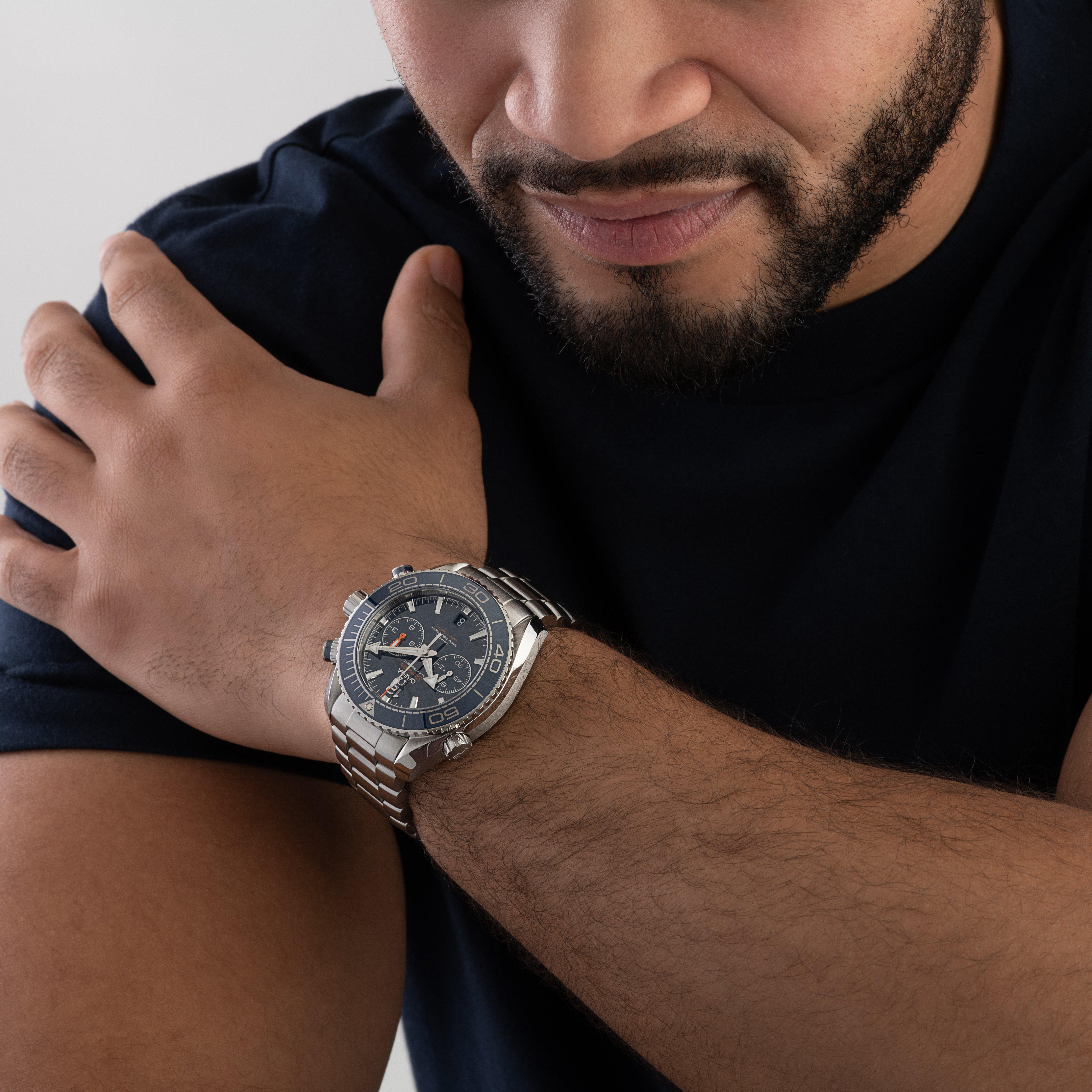 With a deep blue dial that will inspire you to plan your next adventure beneath the waves, this OMEGA Seamaster Planet Ocean 600m Automatic Chronometer Chronograph Men's Watch reflects the brand's passion for the ocean. At A Glance Fastened with a stainless steel bracelet 45.5mm stainless steel case with a blue ceramic unidirectional rotating bezel and 600m water resistance Helium escape valve Scratch-resistant sapphire crystal with anti-reflective treatment on both sides Blue dial with Arabic numeral and baton hour markers Two chronograph sub-dials Date window at 6 o'clock Powered by the OMEGA Co-Axial Calibre 9900 Master Chronometer self-winding automatic movement Minimum power reserve of 60 hours