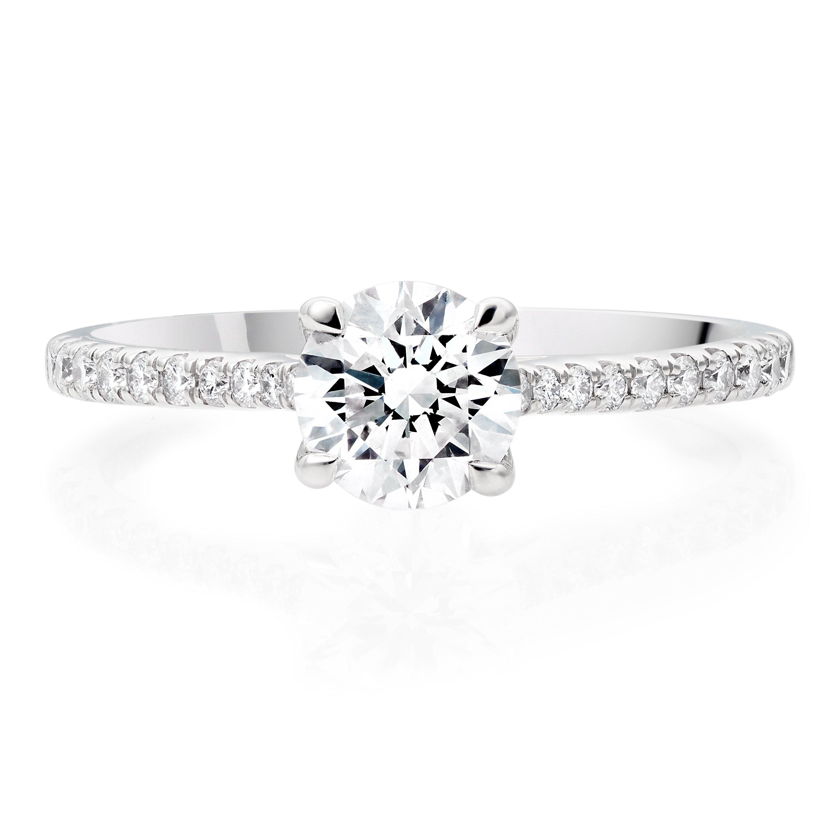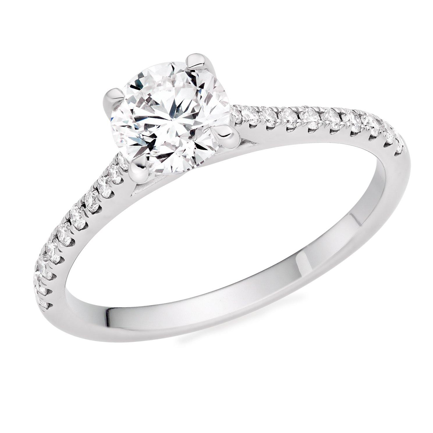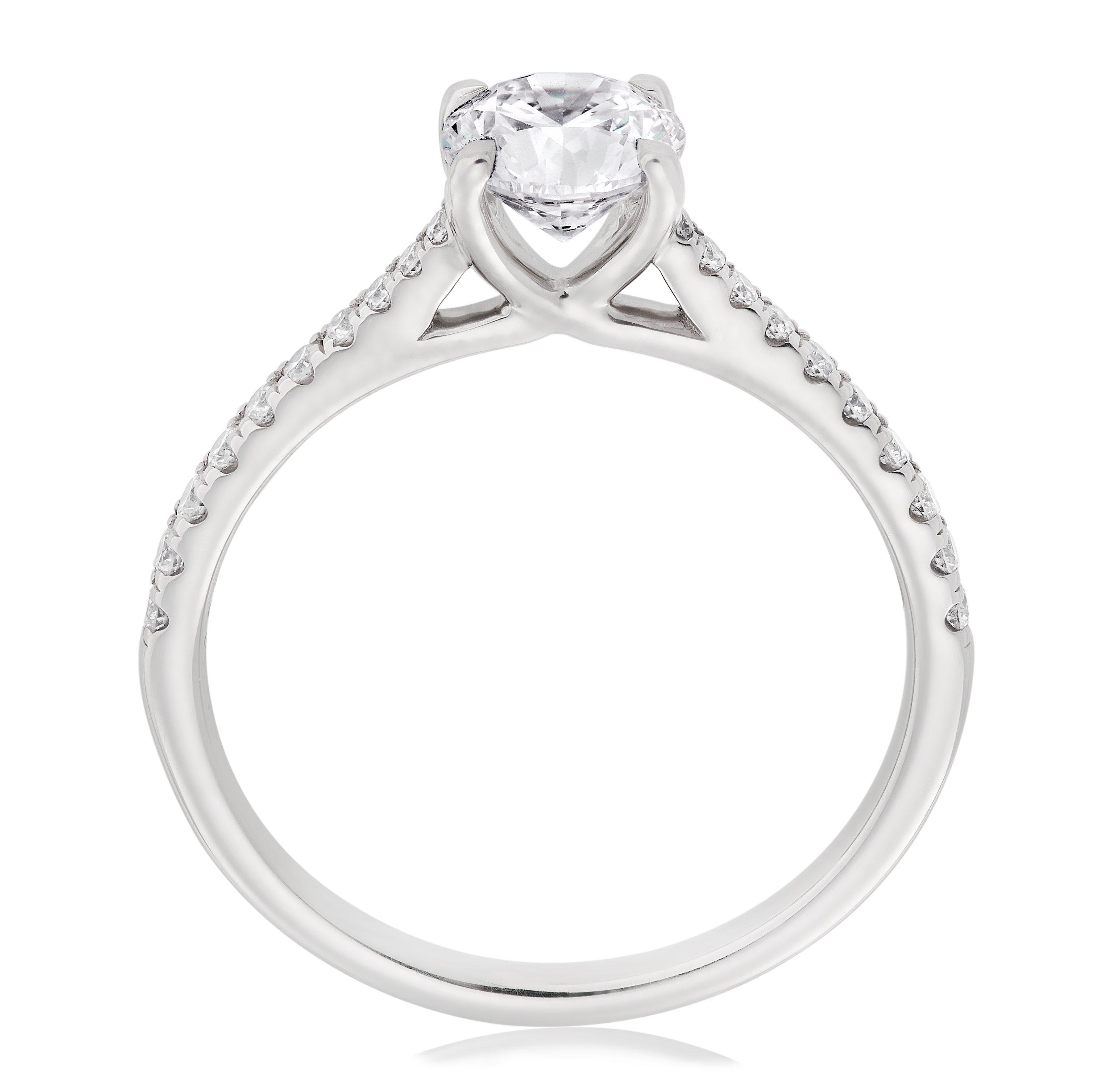 Treasure a lifetime of memories with this Platinum Diamond Solitaire Ring. Beautifully crafted to represent your love for one another, this elegant design reflects romance and luxury for your loved one to cherish forever. At A Glance Crafted in a polished platinum band Featuring diamonds Diamonds embellish the rings shoulders Diamond cut - round brilliant Diamond carat weight - 1.26 Diamond clarity - SI1 Diamond colour - G Please note there may be a 5% variance on the diamond carat weight, as every diamond is unique