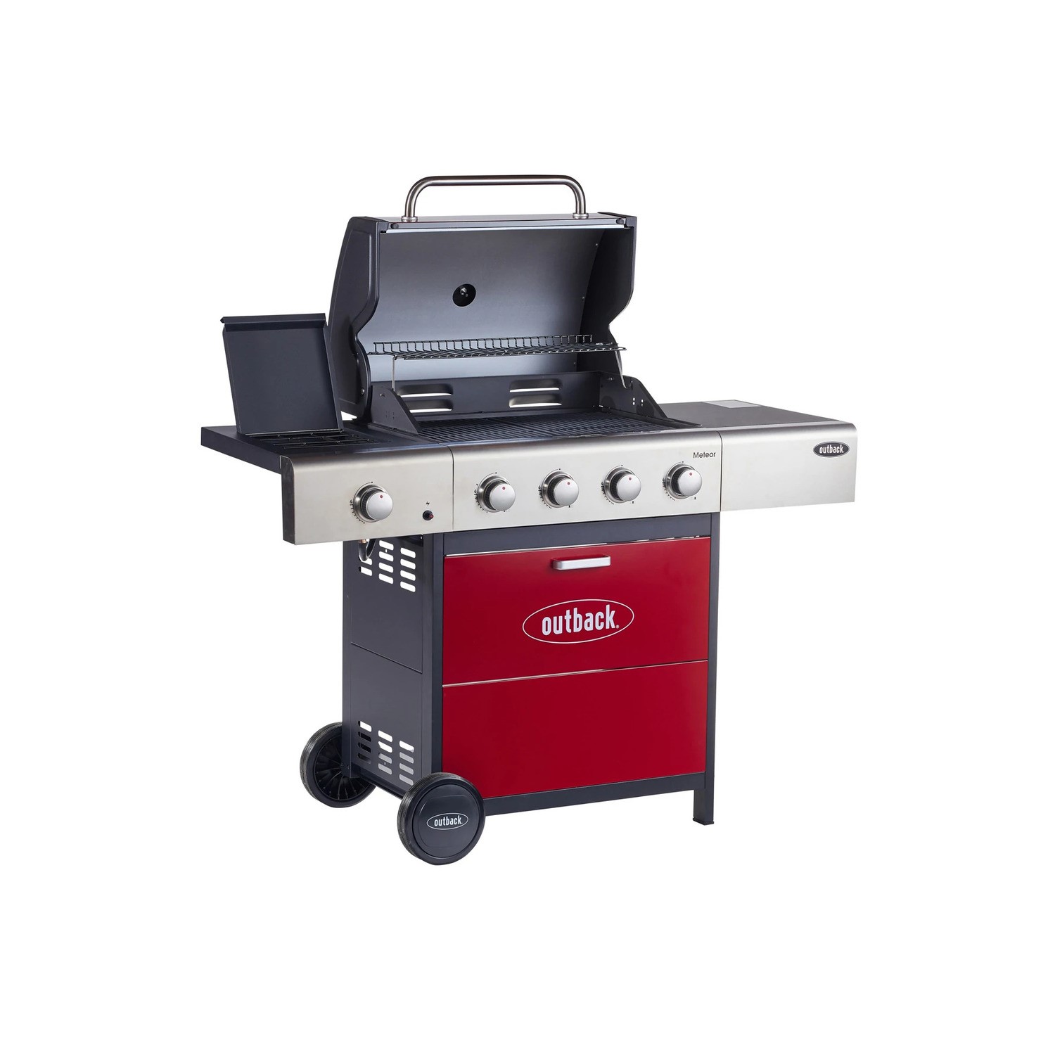 What stands out Features a handy temperature gauge in the hoodFour 12.96kW burners with a 2.94kW side burnerQuality construction with a five-year warrantyRobust stainless-steel burners and flame tamersBold red design built from heavy duty steelGrill quickly and efficiently on this propane gas BBQWheels for easy movement between garden and storagePrebuilt hood and body. Quick body assembly . This Meteor 4 burner BBQ has been designed with 4 high-quality stainless steel burners which can be instantly lit using the electronic ignition system and adjusted independently to give you full control.The porcelain enamelled roasting hood features a built-in thermometer for precision cooking and perfect results every time. The large 64 x 42cm cooking area is covered with a 100% porcelain coated grill to give the results of a cast-iron grill and the convenience of an easily cleaned finish.Both work surfaces are powder coated making them easy to wipe down after use. One side is a fixed side table and the other is a single burner hob which can be covered to provide extra workspace. Ideal for side dishes and sauces.The cart has a useful hinged top draw which is perfect for storing utensils and condiments and the two-tiered drip tray can simply be removed and wiped down after useThis stunning 4 burner gas barbecue has been built to the Outback standard which is loved by many and is covered by a 5 year limited warranty Key Features Porcelain Enamelled Cooking Hood64cm x 42cm Cooking Area4 x Stainless Steel Burners and; Flame TamersSide Burner and; Side Shelf5 Year Limited Warranty .