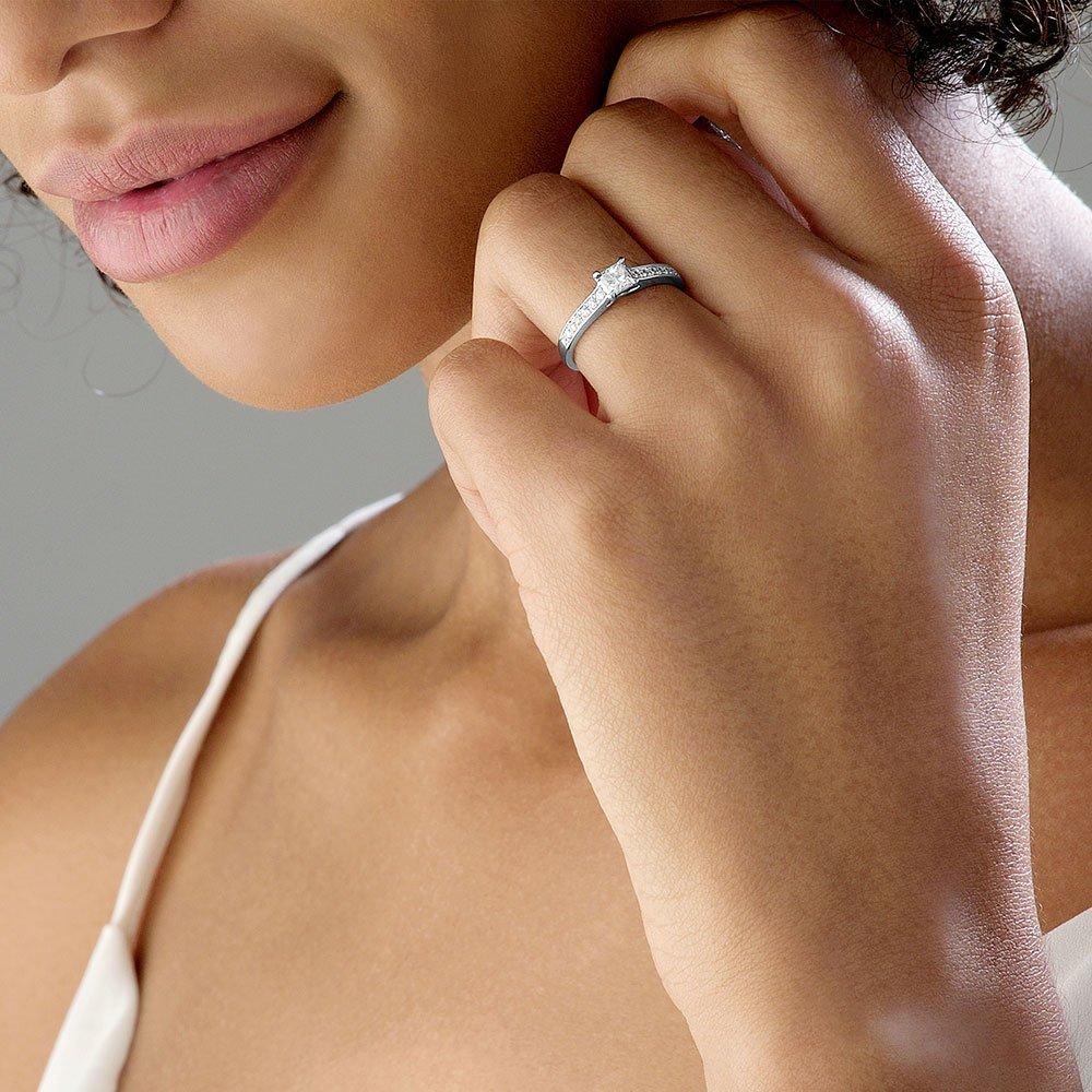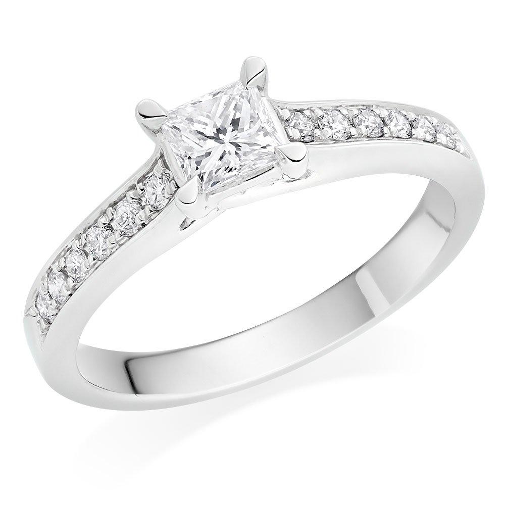 A timeless choice, this Platinum Diamond Princess Cut Solitaire Ring is the most stunning way to begin your next romantic chapter with your loved one. At A Glance Princess cut diamond in the centre Modern four claw setting Polished platinum band Diamonds embellish the ring's shoulders Diamond cut - princess cut, round brilliant Diamond colour - G Diamond clarity - Si1 Total diamond carat weight - 0.43ct Please note there could be a 5% variance on the diamond carat weight, as every diamond is unique