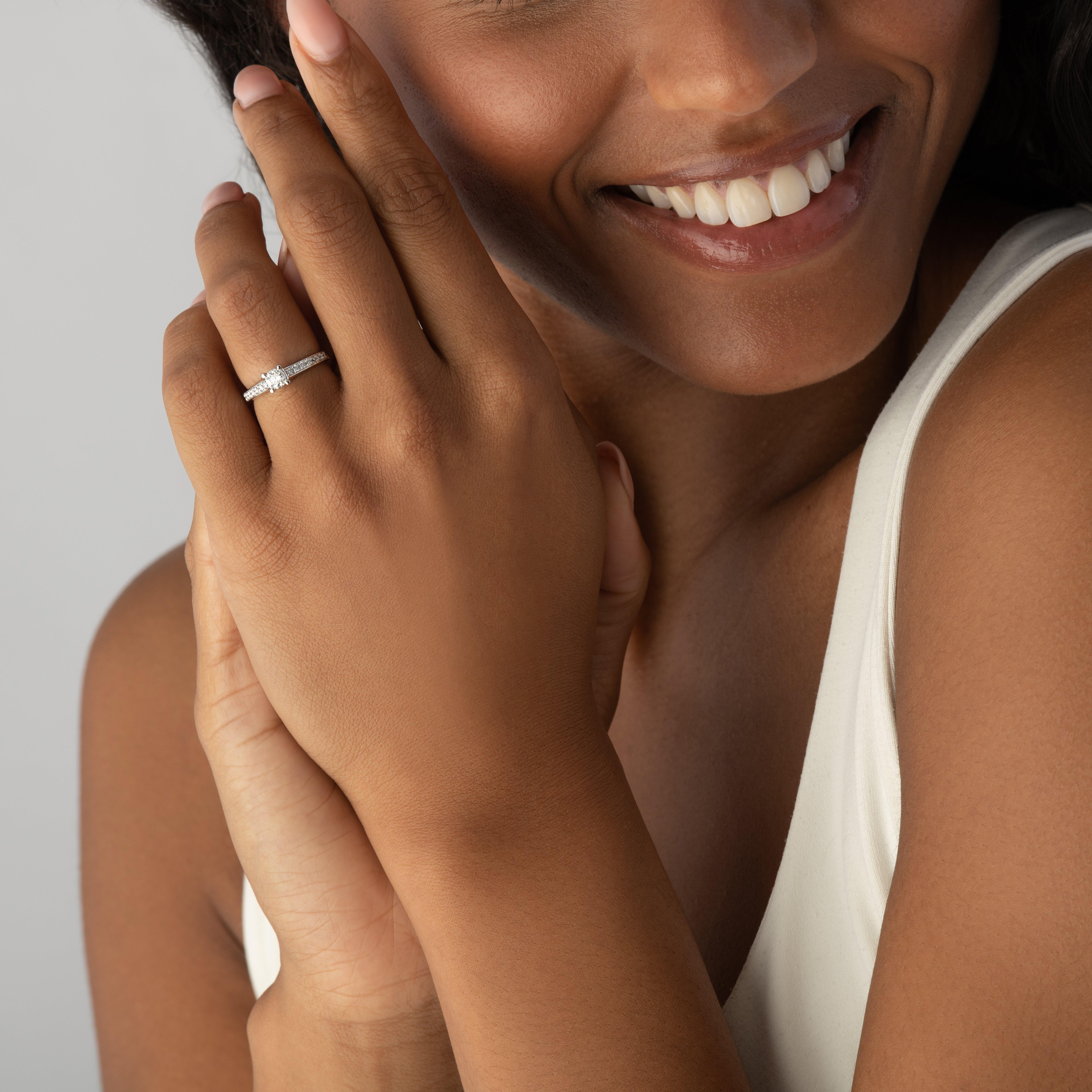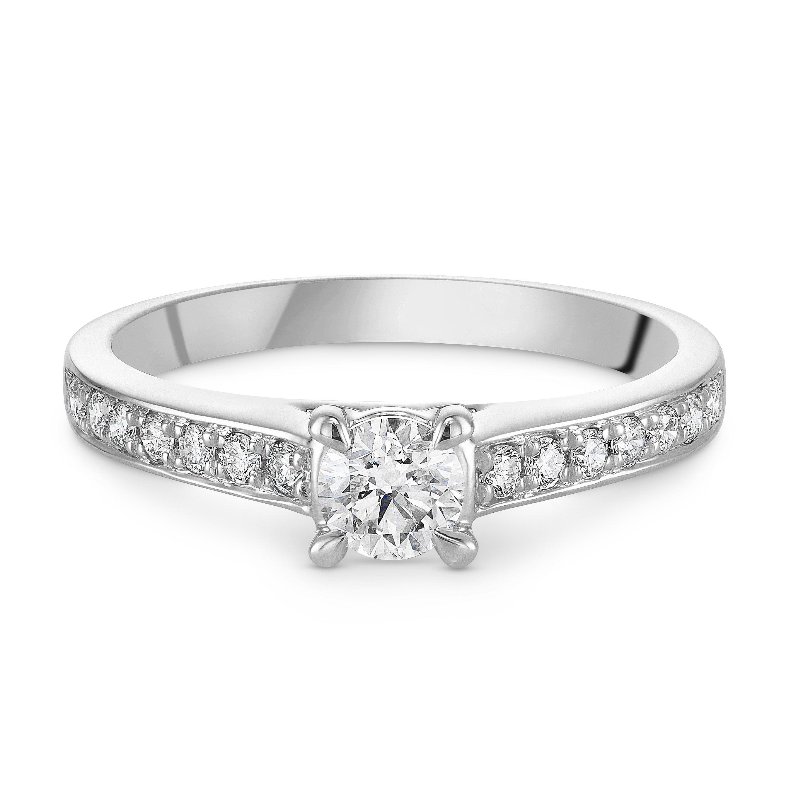 Effortlessly elegant, this stunning Platinum Diamond Solitaire Ring is a pure and eternal expression of love. At A Glance Crafted in a polished platinum band Brilliant cut diamond takes centre stage Set in a contemporary four claw setting Stunning diamond set shoulders Diamond cut - round brilliant Diamond colour - G Diamond clarity - SI1 Total diamond carat weight - 0.48ct Please note there could be a 5% variance on the diamond carat weight, as every diamond is unique