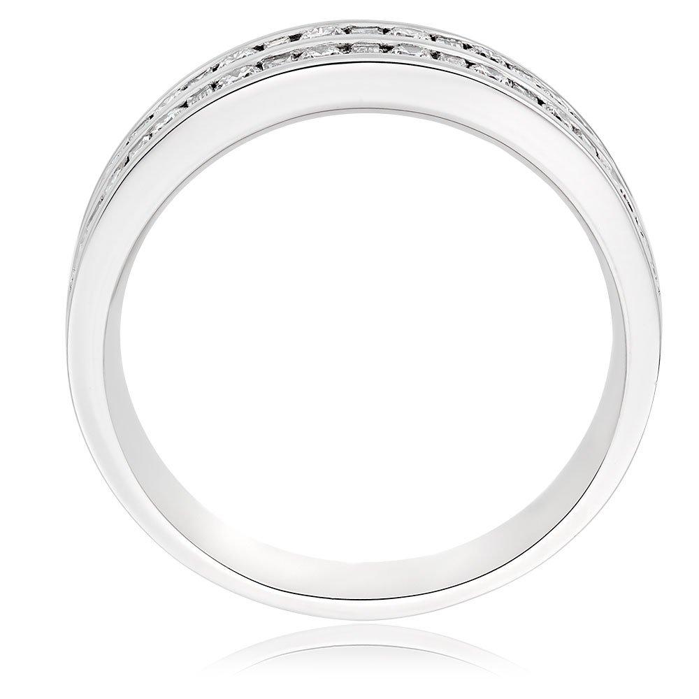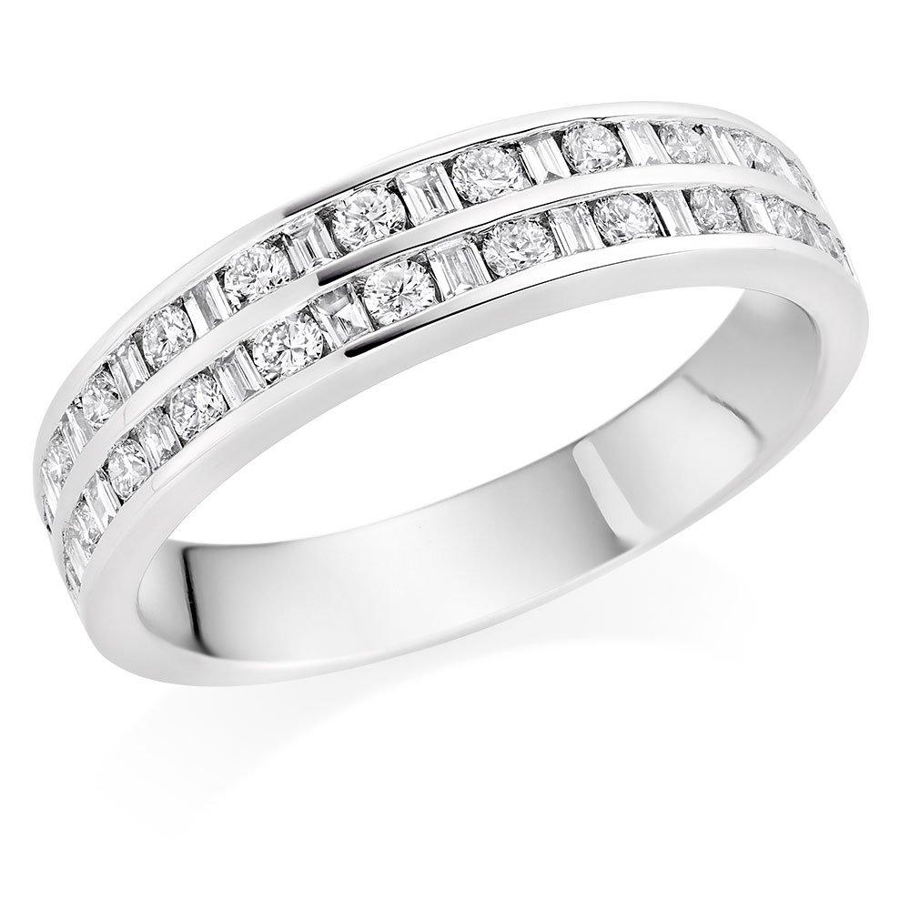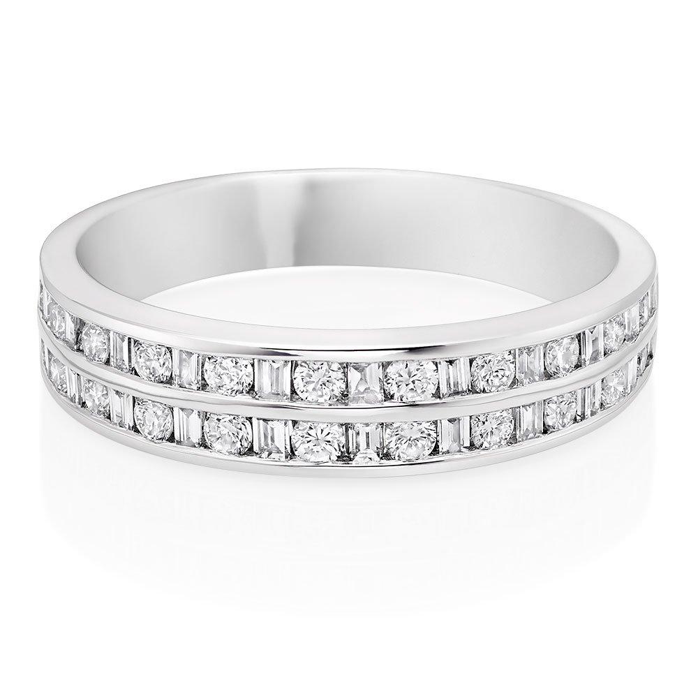 Symbolise your eternal love with this beautiful Platinum Diamond Two Row Ring. We love the fusion of round brilliant and emerald cut diamonds for a vintage feel. At A Glance Presented on a platinum ring with a polished finish Double row of round brilliant and emerald cut diamonds Diamond colour - G Diamond clarity - SI1 Diamond carat weight - 0.56ct Please note there could be a 5% variance on the diamond carat weight, as every diamond is unique