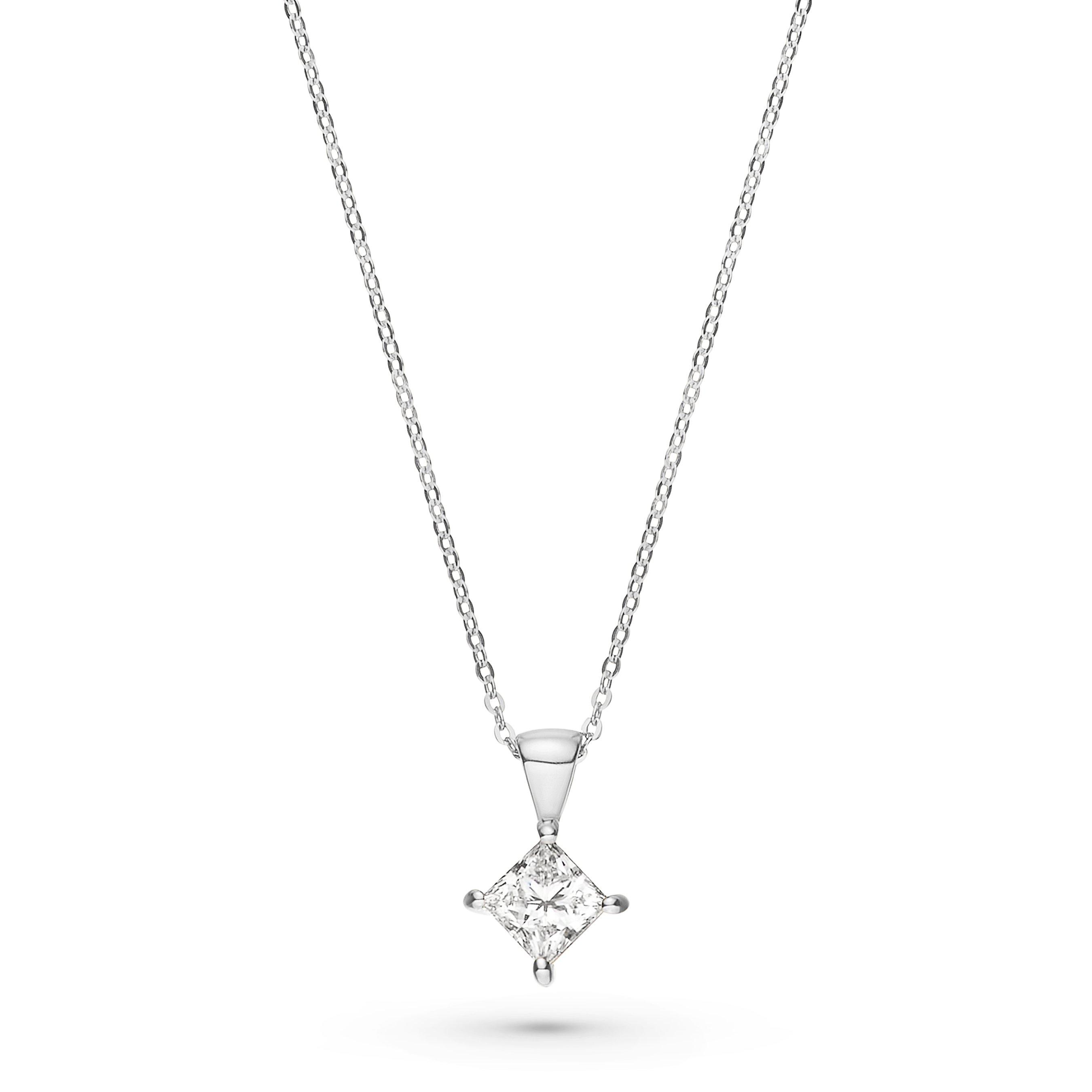 Glistening with fire and brilliance that sparkles with every movement, complete every one of your looks with this Platinum Princess Diamond Pendant. A timeless design that will stand as a cherished staple piece in any jewellery collection. At A Glance Crafted in platinum Featuring a diamond Diamond colour - I Diamond carat weight - 0.70 Diamond cut - princess Diamond clarity - I1 Please note there may be a 5% variance on the diamond carat weight, as every diamond is unique