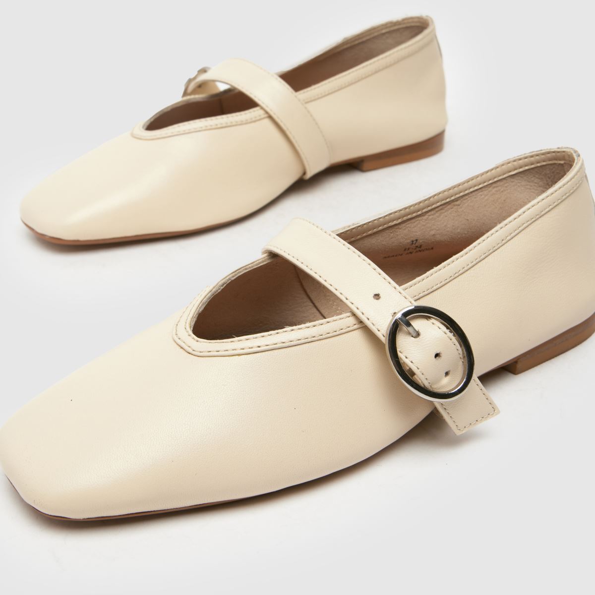 The schuh Lavena Mary Jane Ballerina shoes showcase off-white leather uppers elevated with elegant gold hardware. The ballet-inspired silhouette merges sophistication with playfulness for versatile, chic styling.