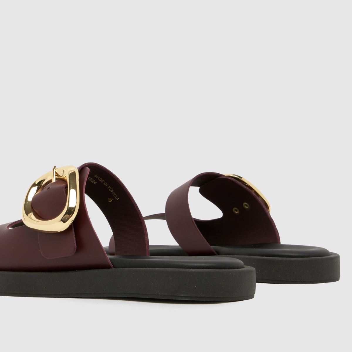 Elevate your look with these sophisticated burgundy leather mules from schuh. The Teela Leather Buckle Sandals feature luxe gold buckle detailing and chunky strap silhouette. The Teela sandal adds effortless on-trend elegance to any outfit.
