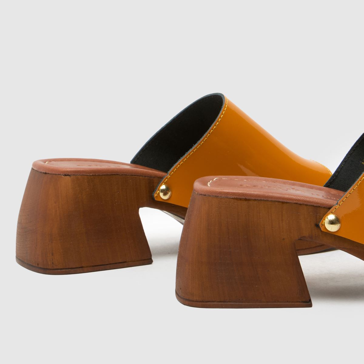 These schuh Via Leather Clogs combine stylish tan patent leather with a chunky platform sole. Gold hardware and open toes add statement appeal, making them perfect for for all-day wear, no matter the occasion.