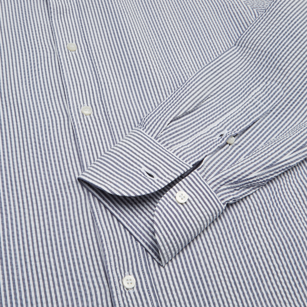 Shirt striped navy blue cotton seersucker, collar style band collar