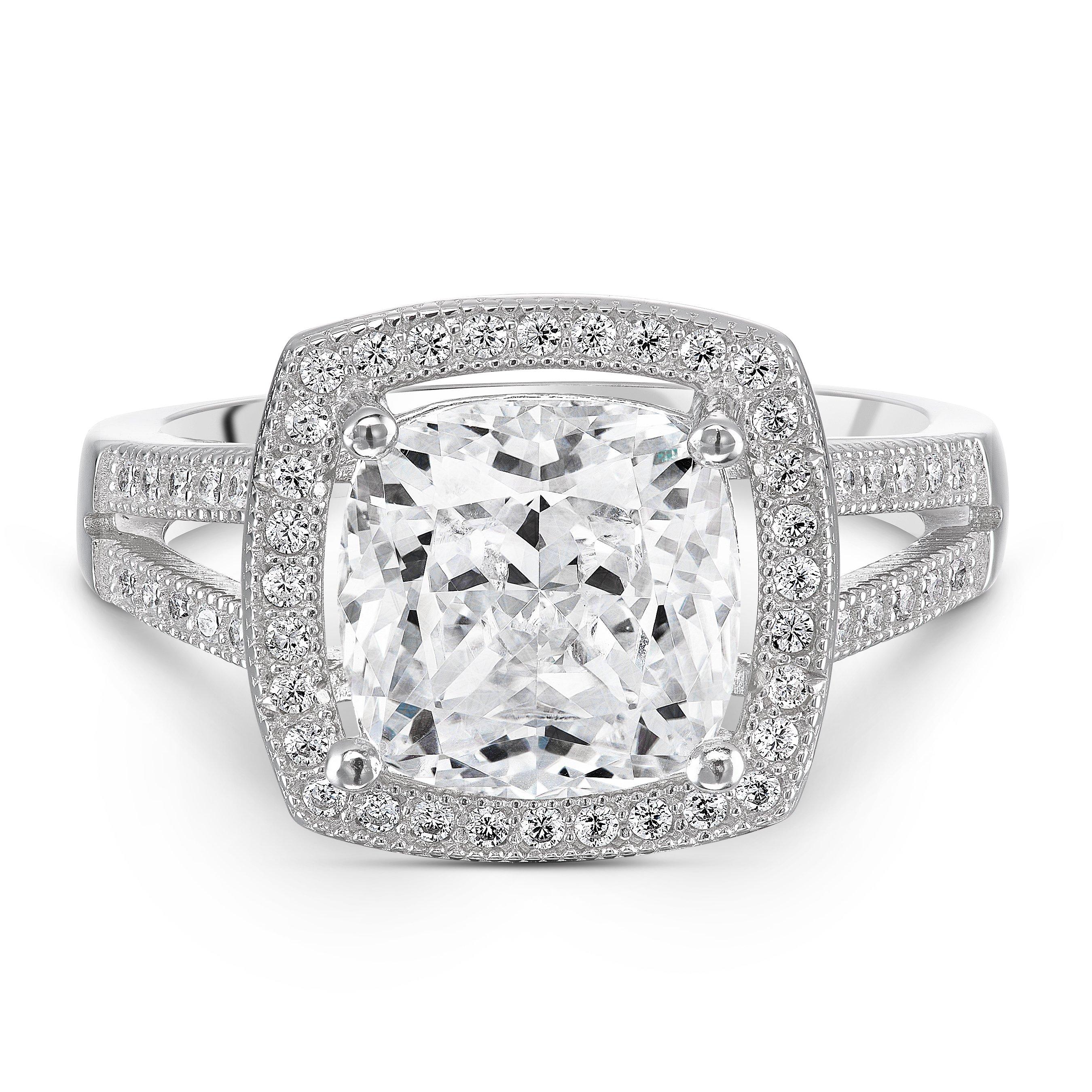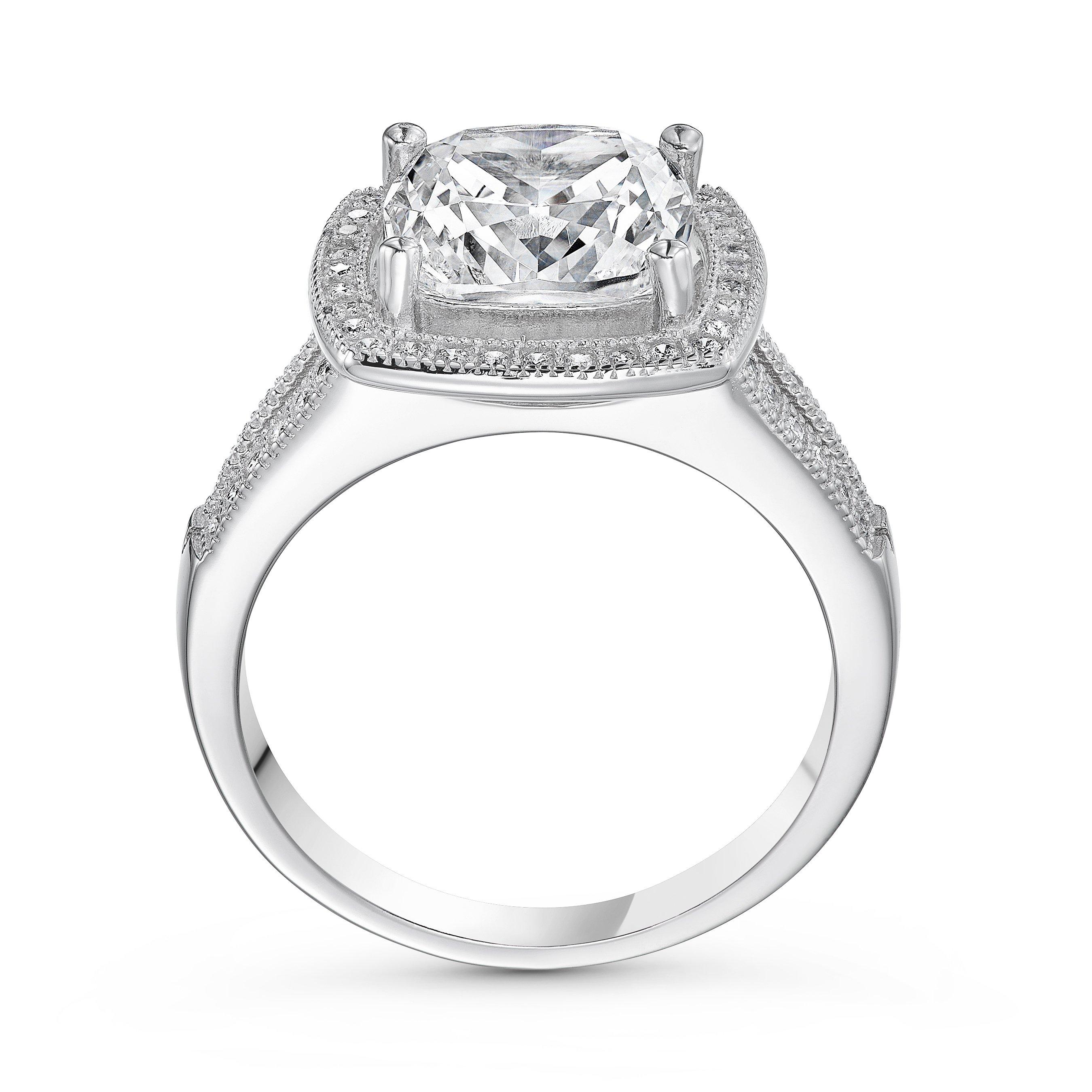 Sterling Silver Cubic Zirconia Cluster Ring. An impressive cushion cut single stone surrounded by a row of cubic zirconias completed with 2 rows of stone set shoulders. This ring is the perfect statement piece for your collection.