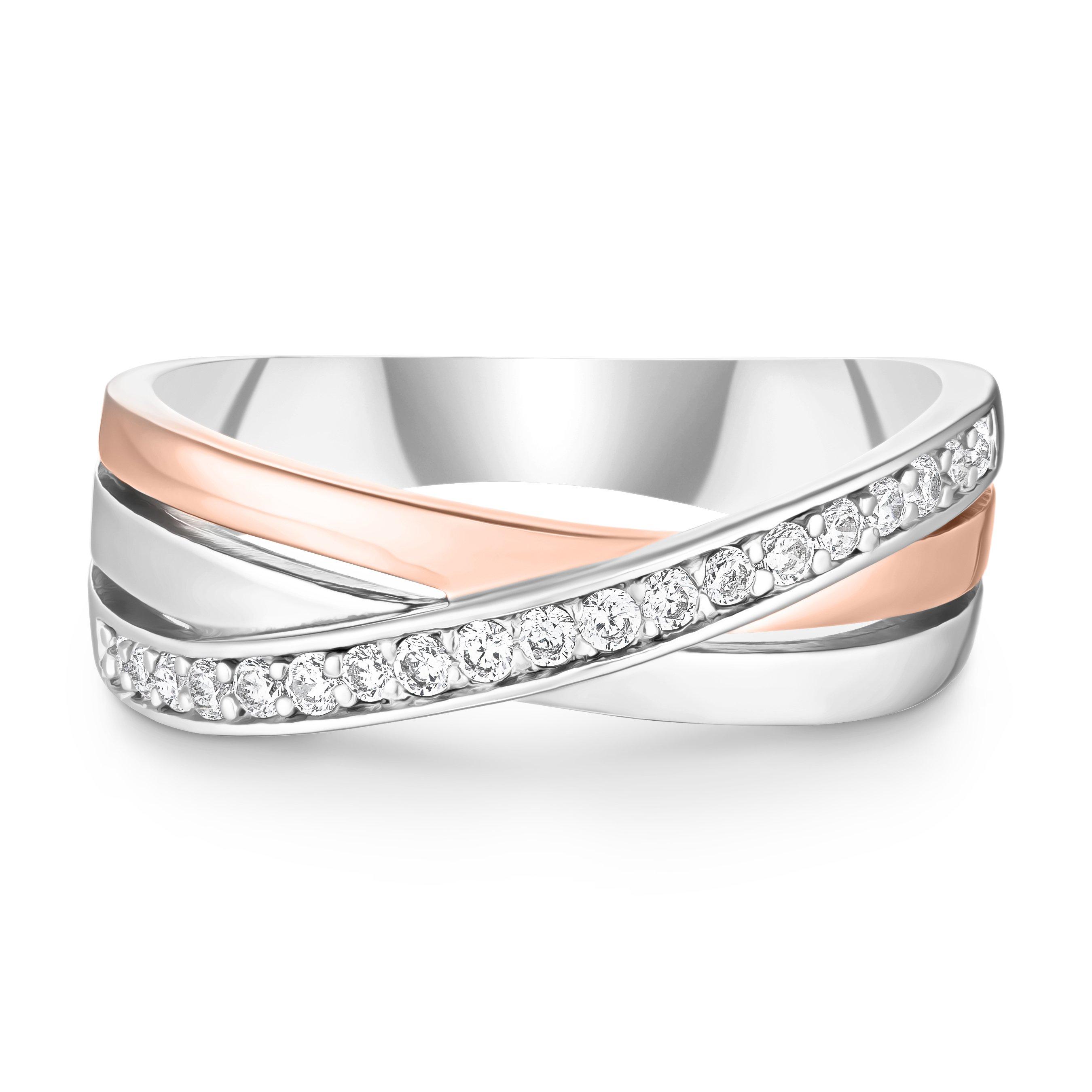 This stunning Silver Rose Gold Plated Ring exudes sophisticated glamour with a glittering cubic zirconia embellishment and a modern crossover effect. At A Glance Combines sterling silver with rose gold plated sterling silver Features sparkling cubic zirconia