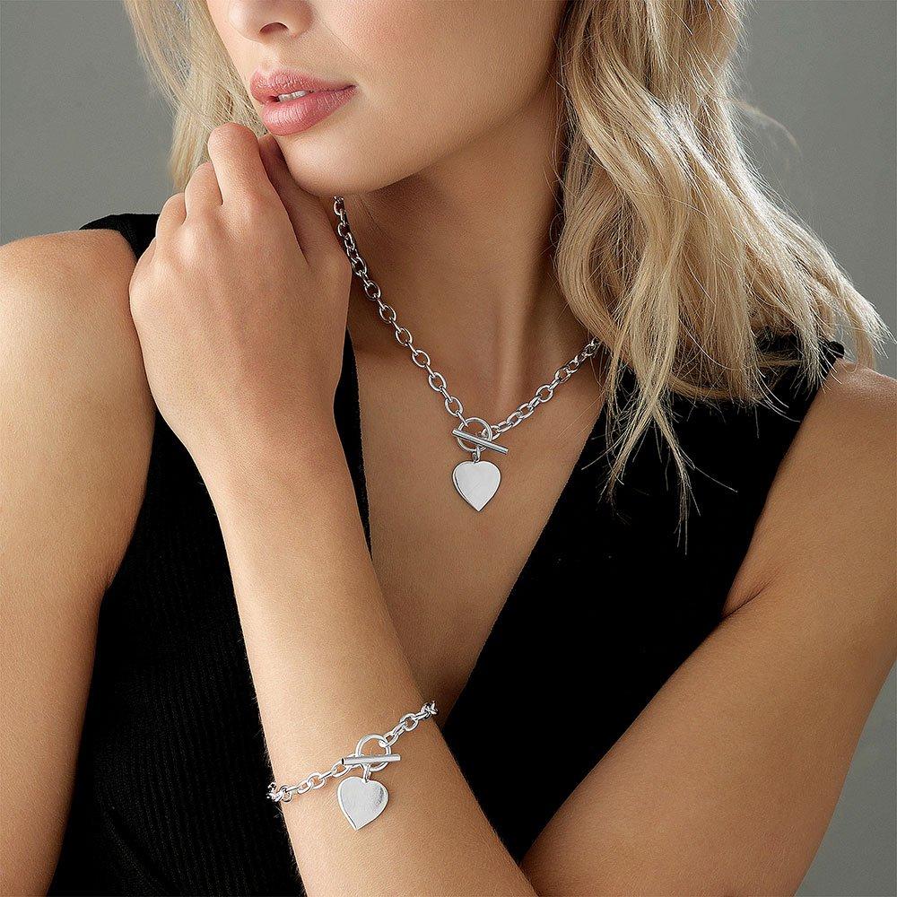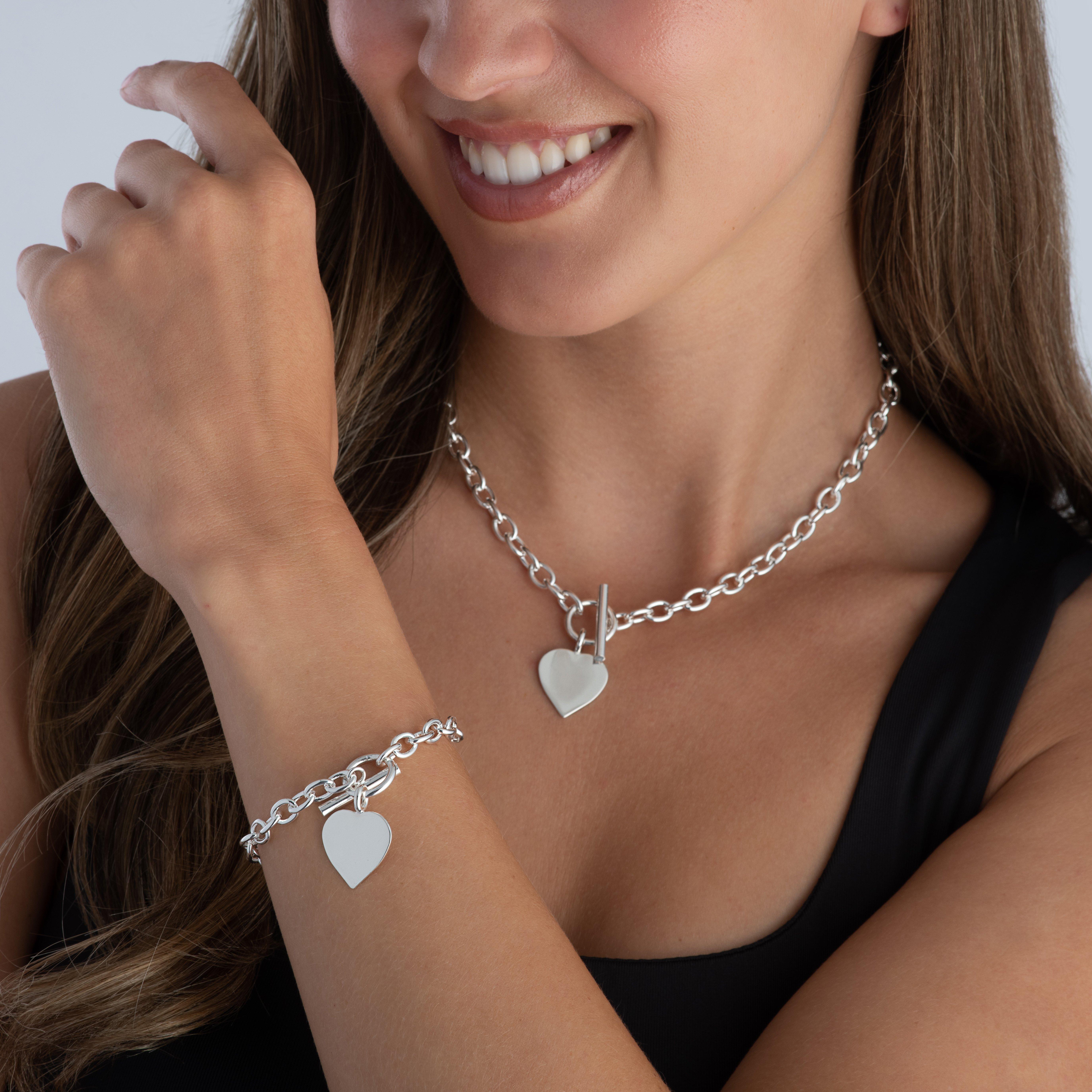 Fun and feminine, this Silver T-Bar Heart Necklace and Bracelet Set is the perfect way to give your heart to someone special. At A Glance Designed in silver Pretty necklace with a polished chain T-bar fastener with a beautiful heart charm Matching bracelet