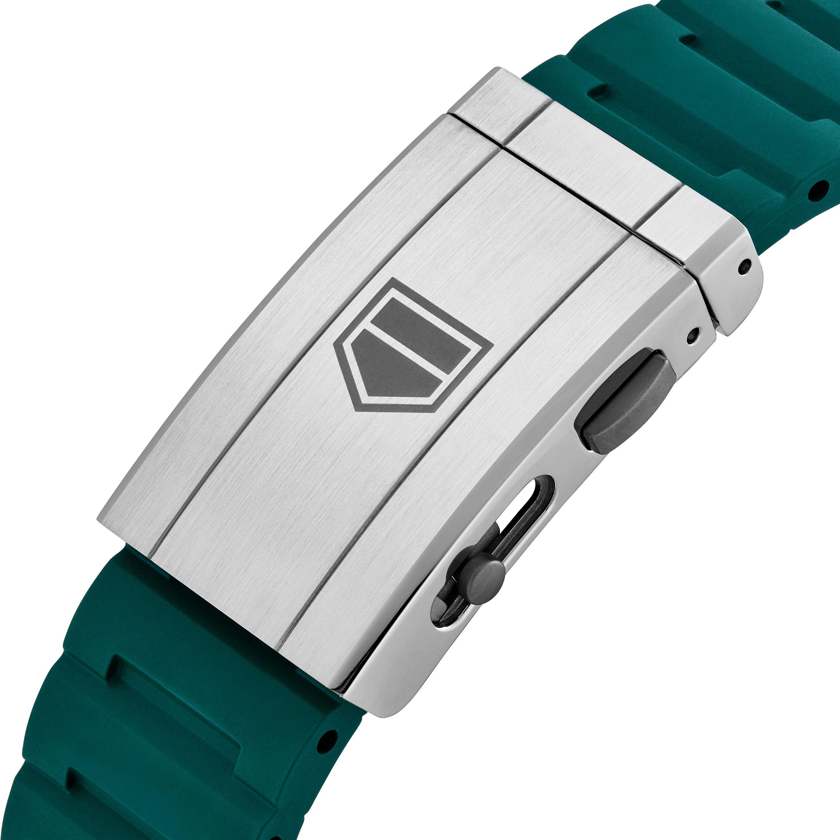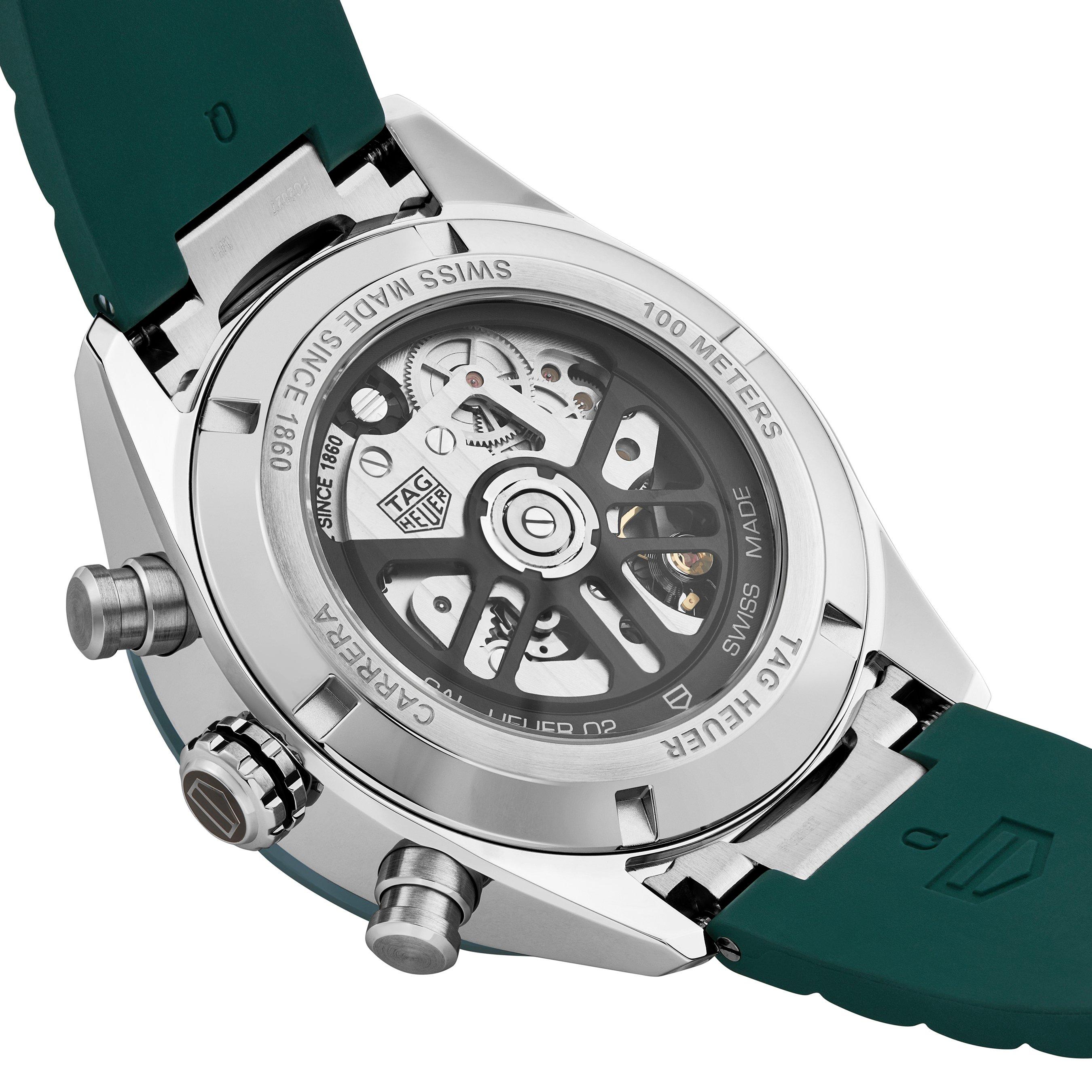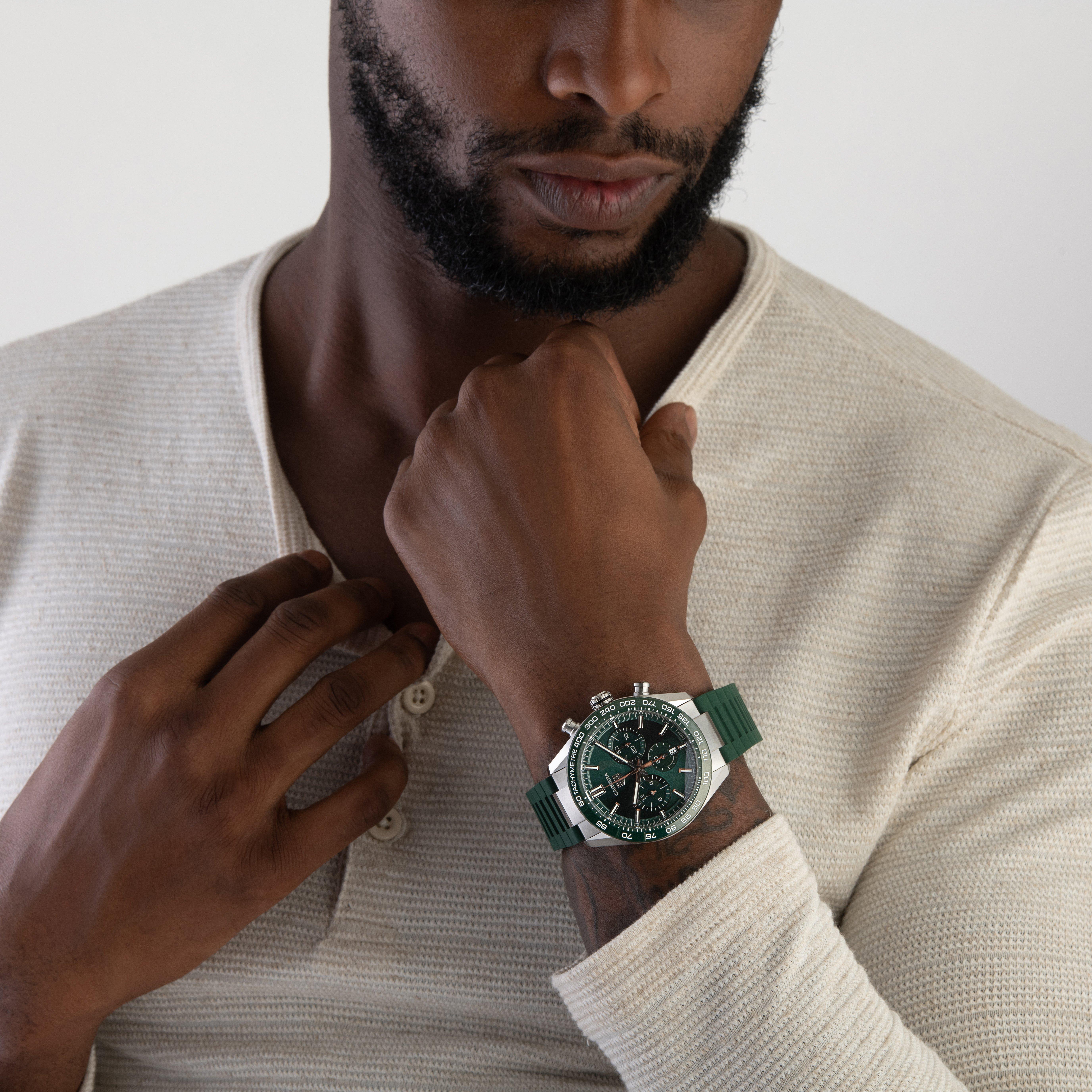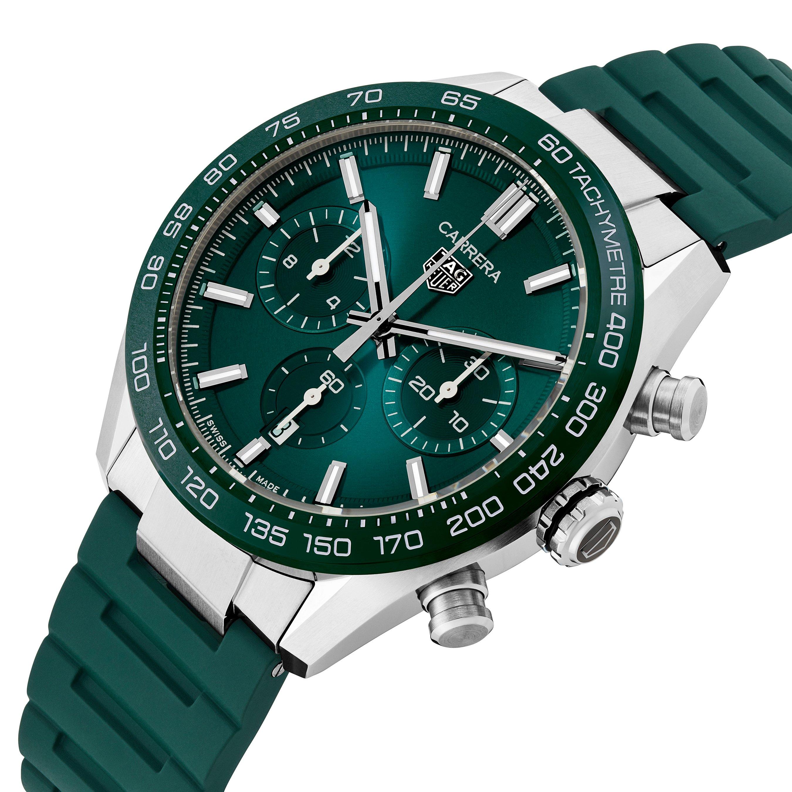 Delivering bold elegance, this TAG Heuer Carrera Chronograph Automatic Men's Watch showcases a sporty aesthetic with a captivating enhancement. Equipped with the impressive Calibre Heuer 02, this incredible timepiece is ready to make a powerful impression. At A Glance Presented on a green rubber strap and finished with a foldover clasp 44mm case with 100m water resistance Green dial with stainless steel hands and hour markers Date window displayed at 6 o'clock Sapphire crystal glass Powered by an automatic movement