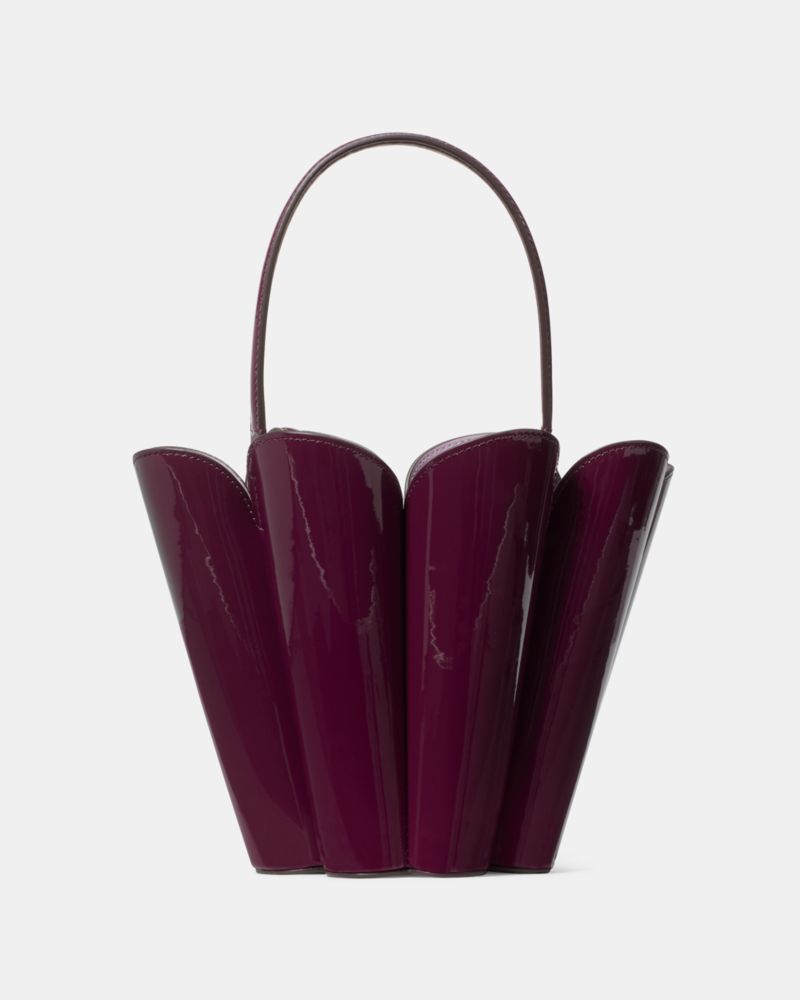 Inspired by the shape of our iconic logo, meet the Spade Flower Bucket Bag. Done in super-sleek patent leather, this structured piece comes with an optional crossbody strap. Our favorite part? The hidden stitched spade flower you can find on the bottom. Kate Spade Women's The Patent Spade Flower Bucket Bag in Purple Agate Leather Animations