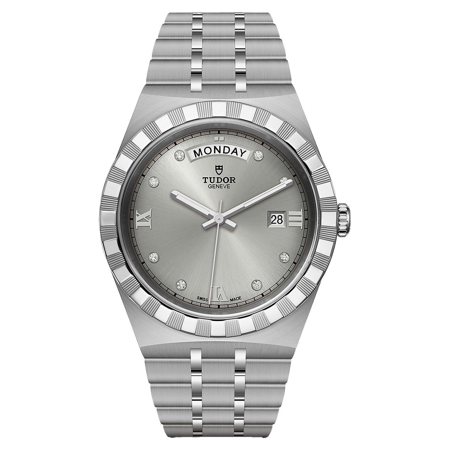 Discover the spirit of an iconic collection with this TUDOR Royal 41mm Diamond Automatic Watch. With its integrated stainless steel bracelet, notched bezel and automatic movement, this timepiece is the epitome of high-performance and impeccable style. At A Glance Presented on a 5-row 316L stainless steel integrated bracelet with satin-brushed external and central links, polished intermediate links and fastened with a folding clasp and safety catch 41mm stainless steel case with a polished and satin finish Notched bezel in 316L stainless steel, alternating cut grooves and polished finish Stainless steel screw-down winding crown with the TUDOR logo Waterproof to 100m Sunray-finished silver dial with diamonds and applied Roman numerals Sapphire crystal glass Day window displayed at 12 o'clock and date window displayed at 3 o'clock Powered by self-winding mechanical movement, Calibre T603 Power reserve of approximately 38 hours